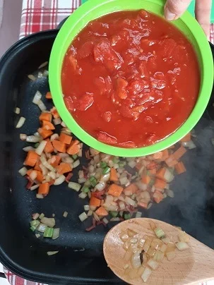 1. Add a little olive oil, or similar, to the pan. Start by frying onions, carrots, celery and any stalks on a medium-low heat for a few minutes until they start to soften. Add diced tomatoes.