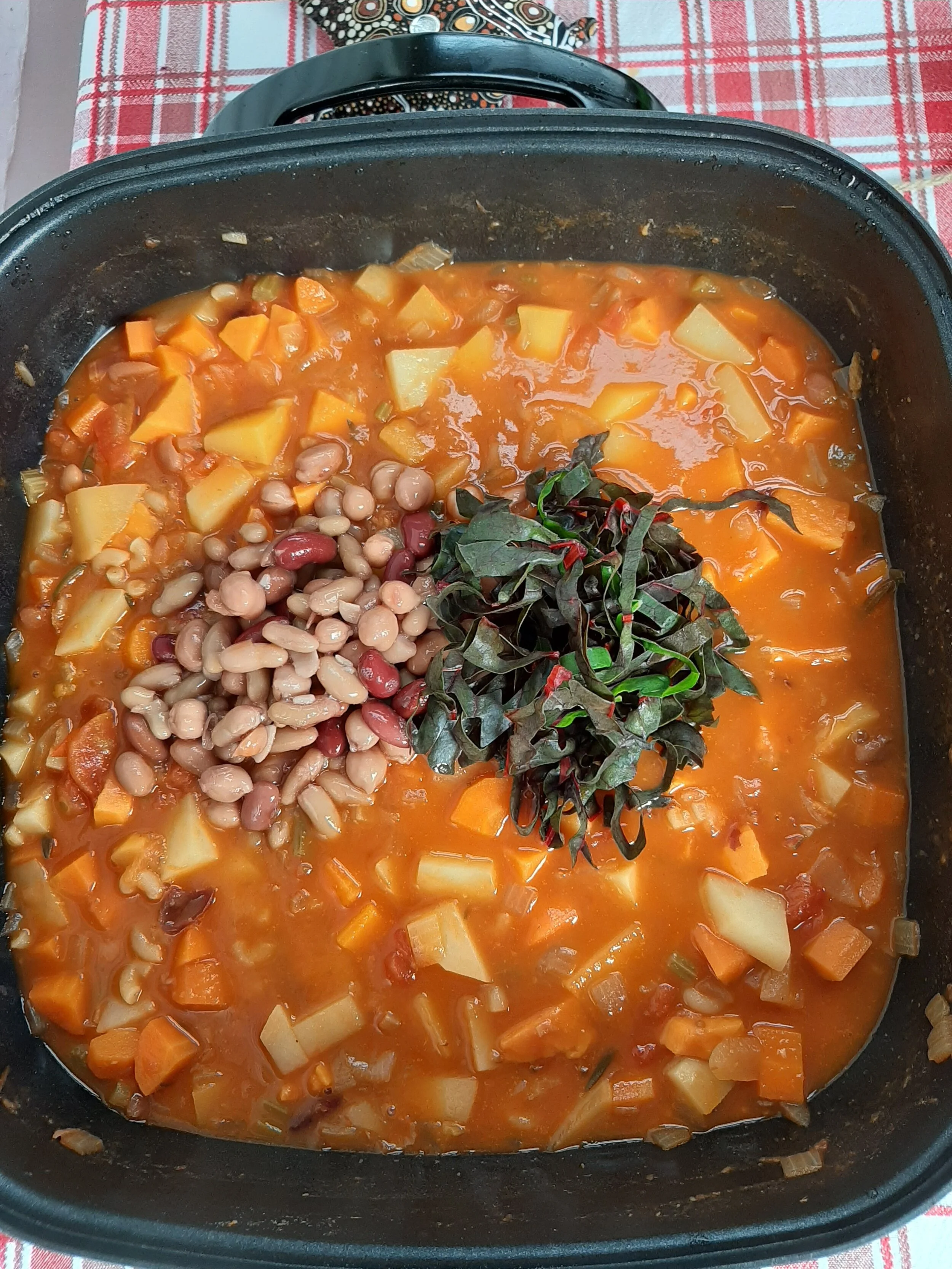 2. Add mashed beans and enough water to cover the vegetables by a couple of centimetres. Add any sprigs of fresh (or dried herbs) and bring soup to a boil.
