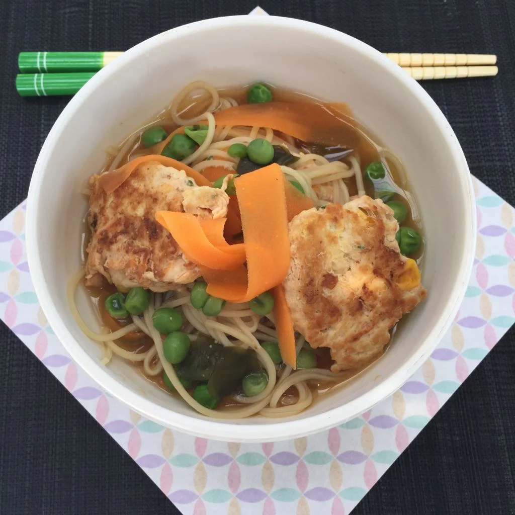 Option 3: Noodle Soup - In a small saucepan, dissolve a sachet of miso soup in a cup of hot water and bring to the boil. Add some dried fine egg noodles (about half a nest) and carrot ribbons (using a peeler, shave ribbons of a peeled carrot). Simmer for 2-3 minutes. Add some frozen peas and 3 chicken patties for the last minute of cooking, to cook peas and warm patties through, for your almost instant, but oh - infinitely tastier and healthier - version of ‘pot noodles’.