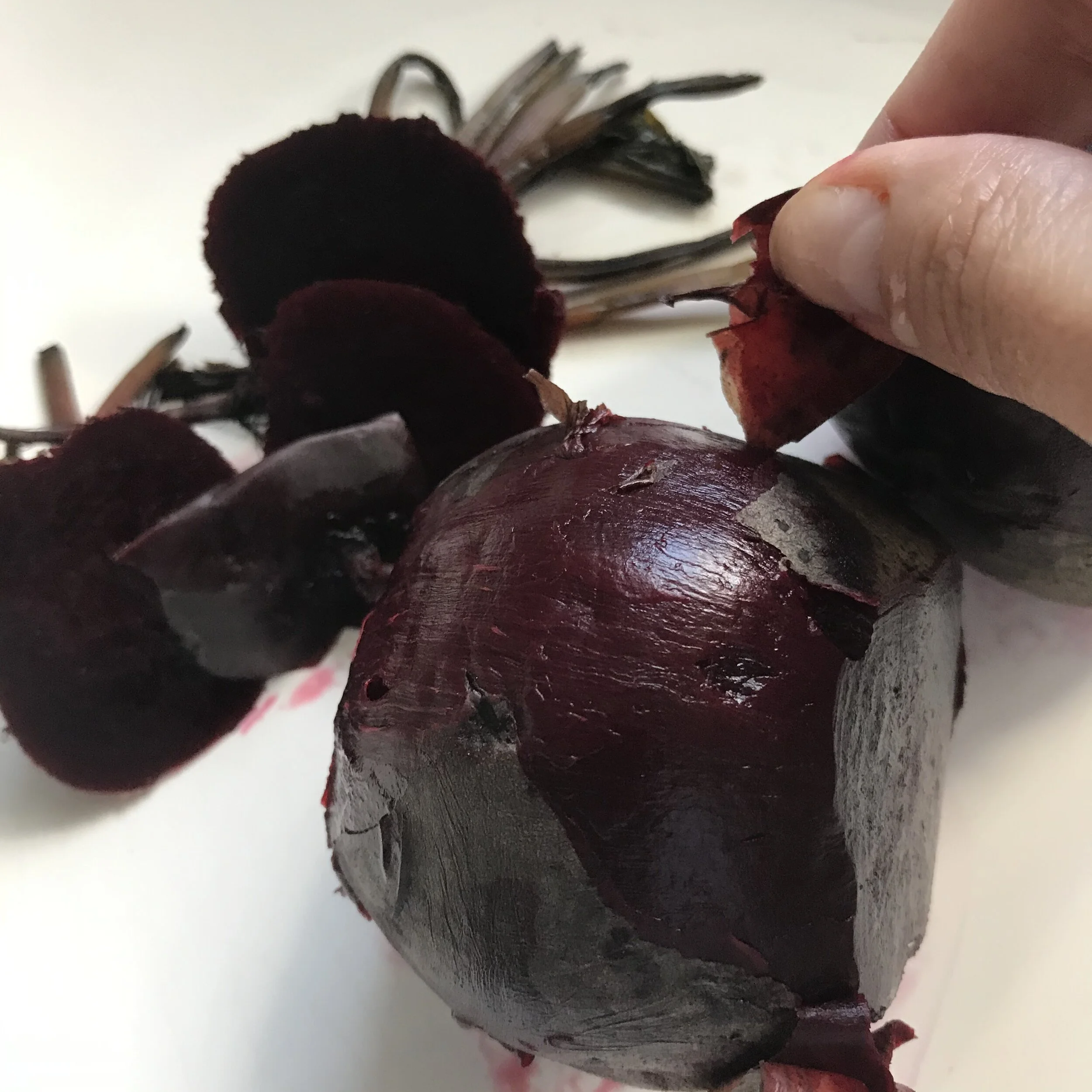 3. To peel beets, cut off both ends and remove the skin by easily peeling it off, using your fingers or the flat end of a knife.