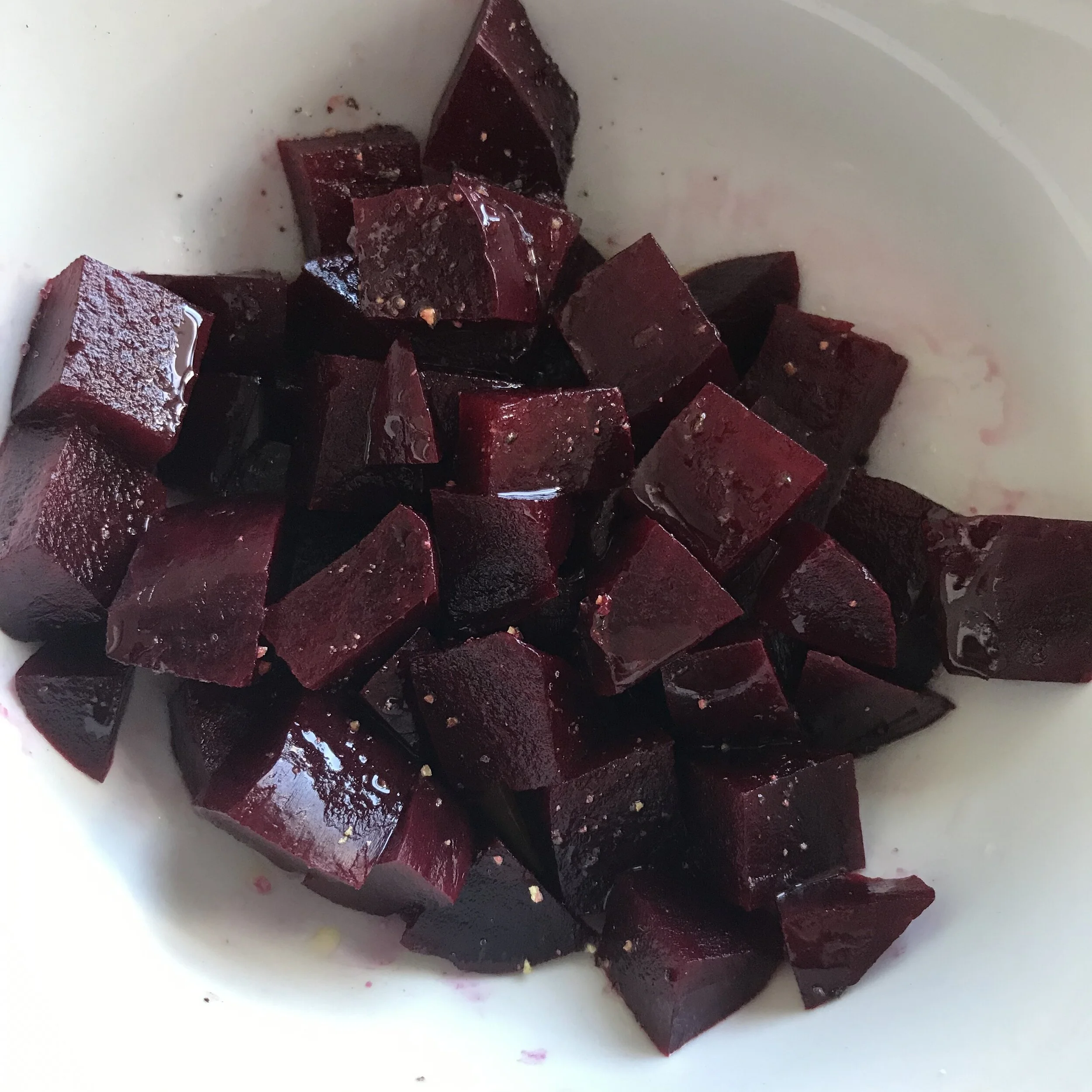 1. Place cubed beets in a bowl. Season with salt, pepper, the lemon juice and a drizzle of olive oil. Toss to combine.
