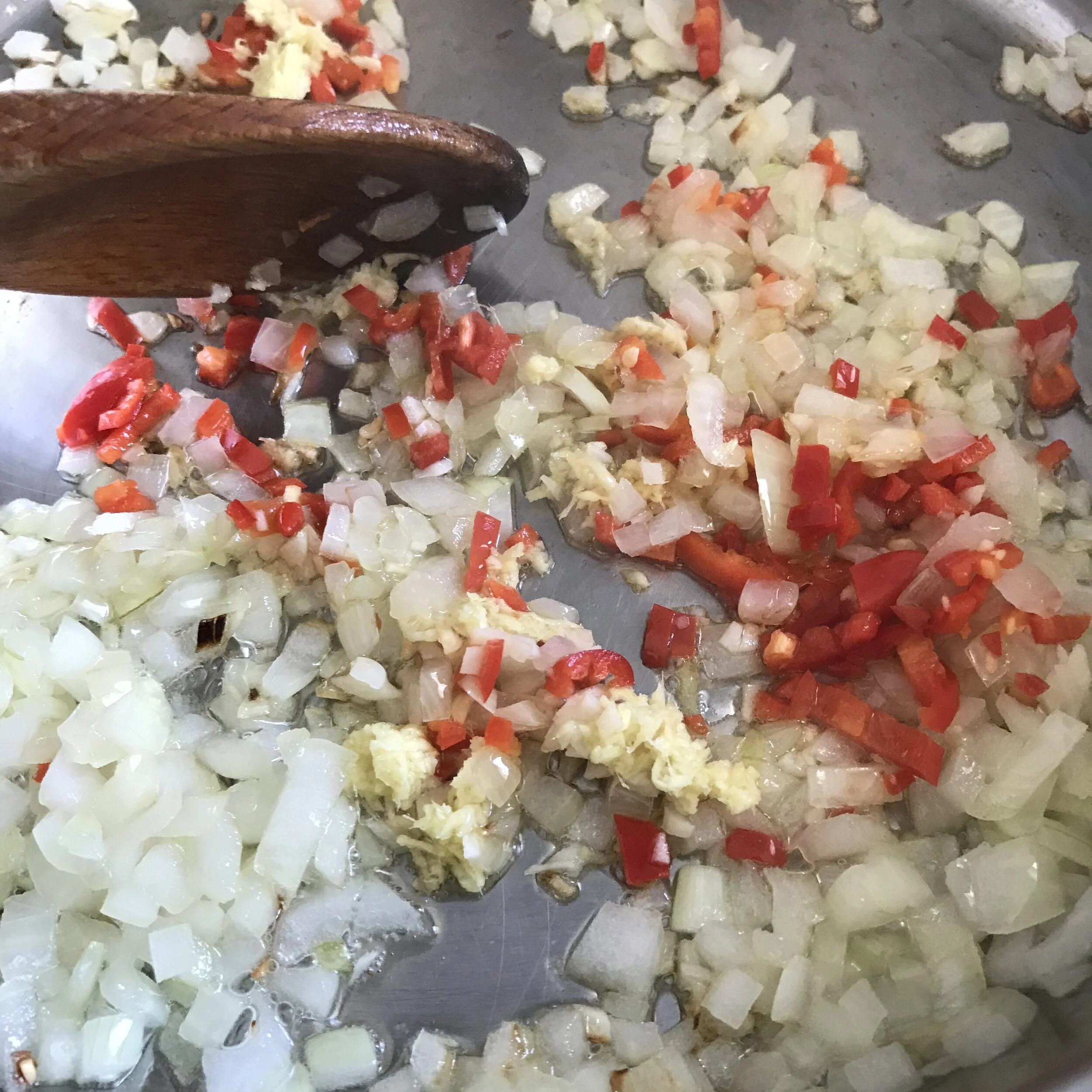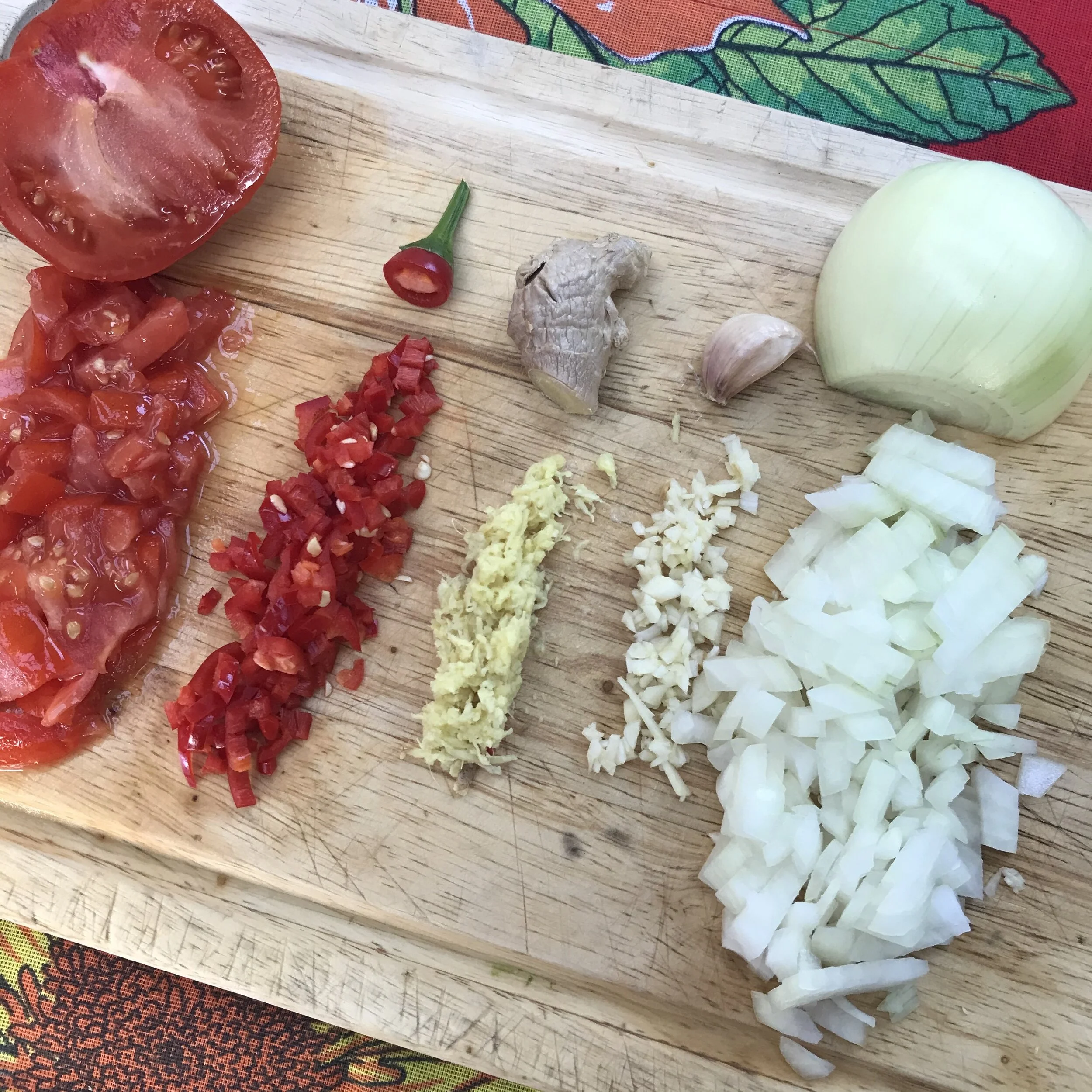 1. Heat the oil in a large frying pan or saucepan and add chopped onions, garlic, ginger and chilli. Fry on a medium- low heat, for about 8 minutes, stirring occasionally, to prevent burning. If you feel it’s starting to brow too quickly, add a touch of water (1-2 tsp).