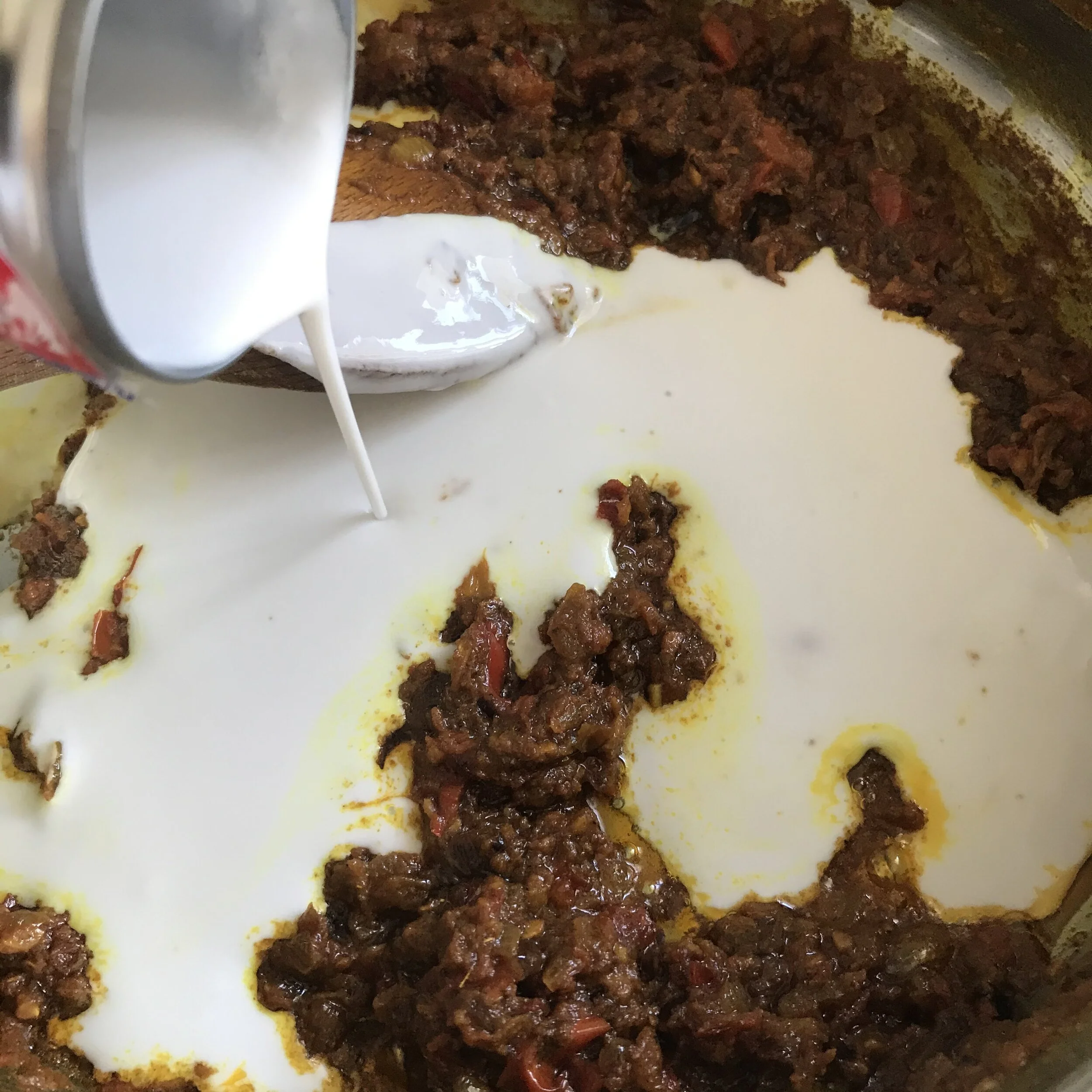 4. Add the coconut milk and stir to combine. Let it bubble for a few minutes and taste to see if needs more seasoning. Sometimes, if using canned tomatoes, I add a pinch of sugar, to adjust the acidity. If sauce is too thick, add a little water, using the coconut milk as a measure and adding up to ½ can of water.