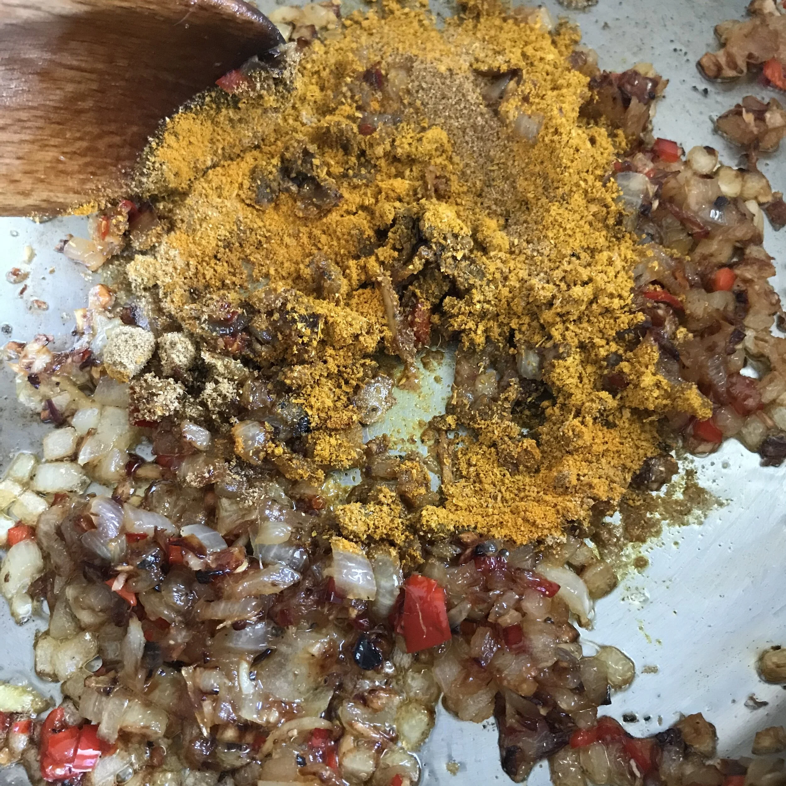 2. Combine the spices: turmeric, cumin and curry powder and add to the pan. Stir and continue frying for about 5 minutes. This time, if too dry, add a little extra cooking oil or butter.