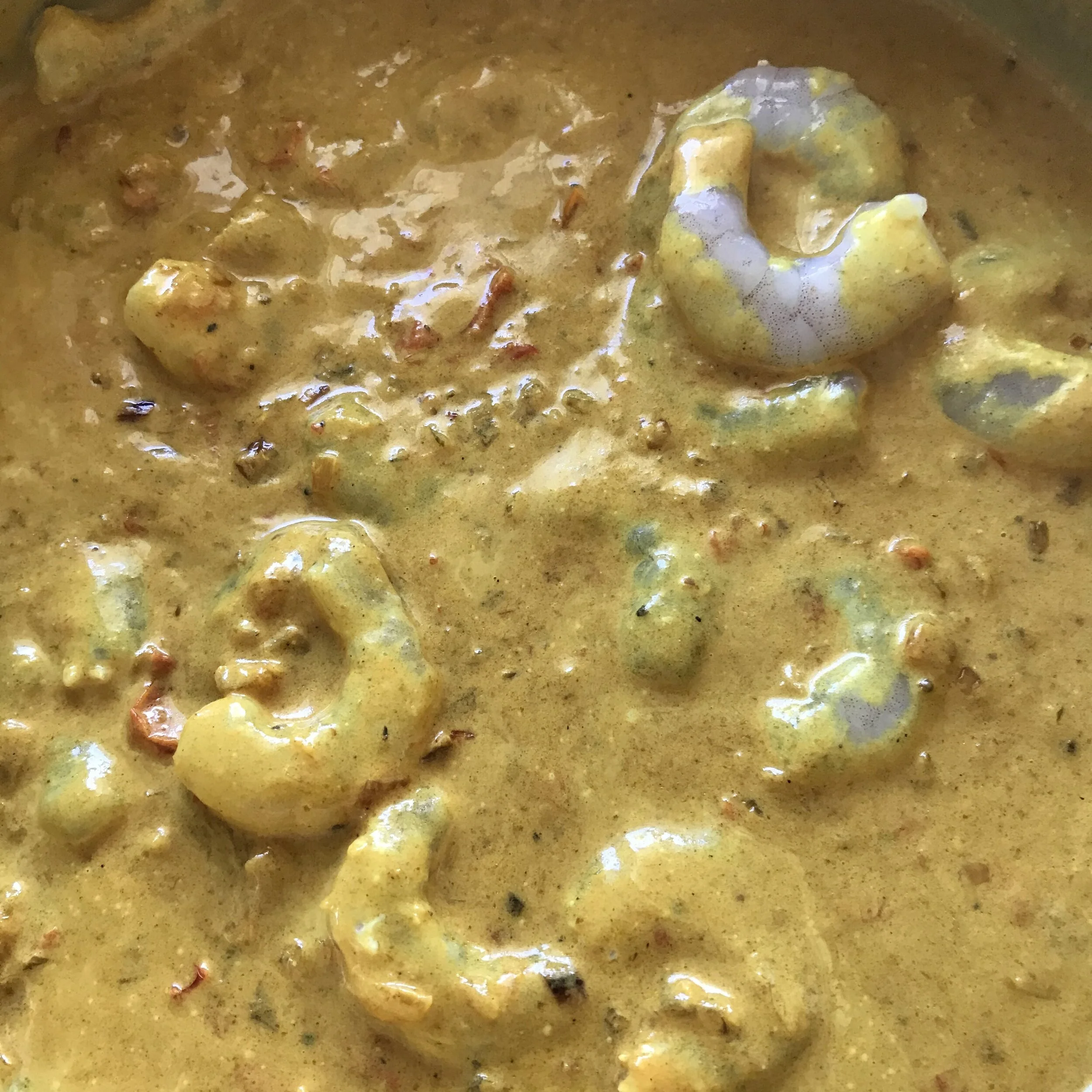 6. Once prawns and peas are cooked, finish the curry with a squeeze of lemon juice. Taste and season to taste, if needed.