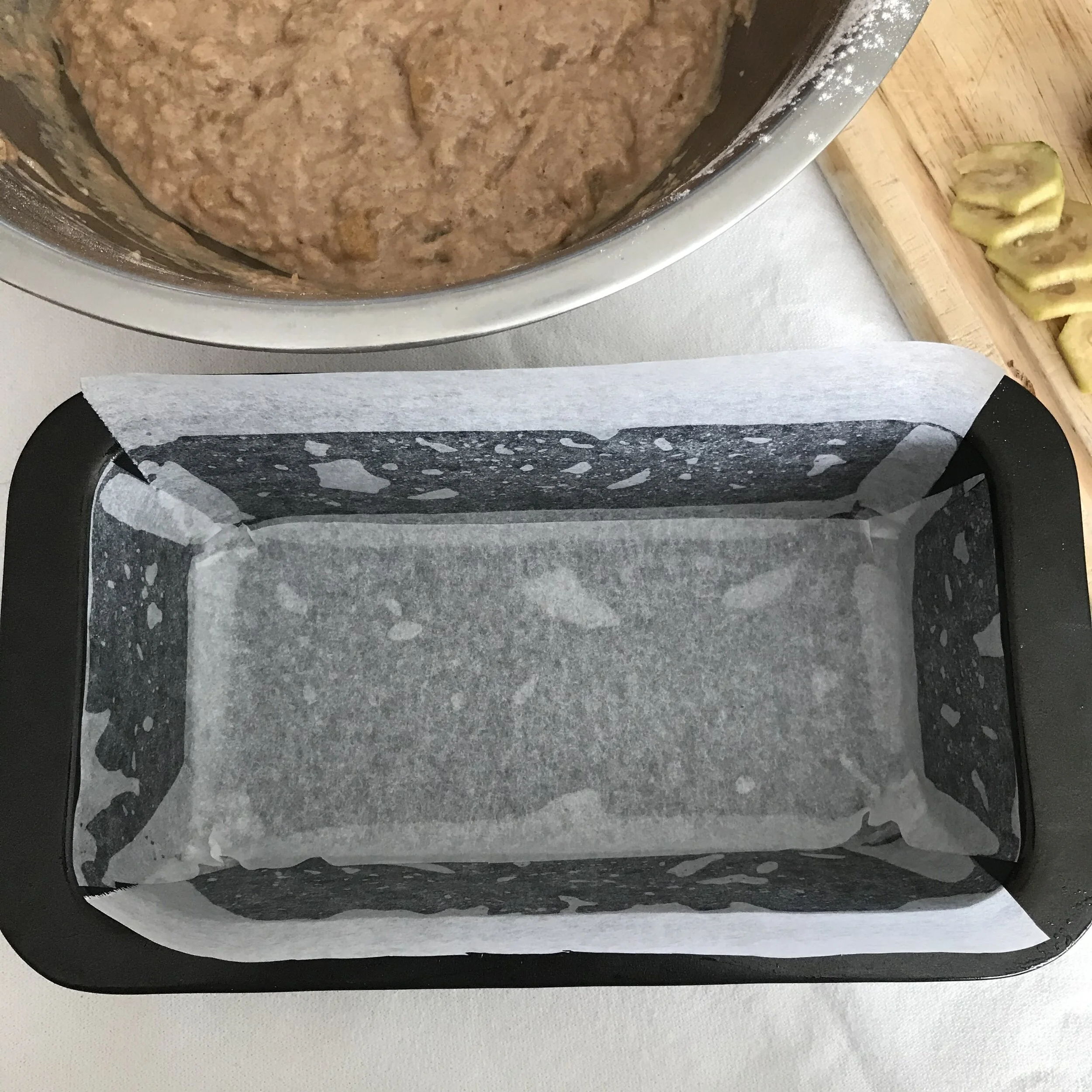 2. Preheat the oven to 180°C and line the loaf tin with baking paper (lightly spray tin with cooking spray or rub a little butter to help the paper sticking to the tray). Reserve.