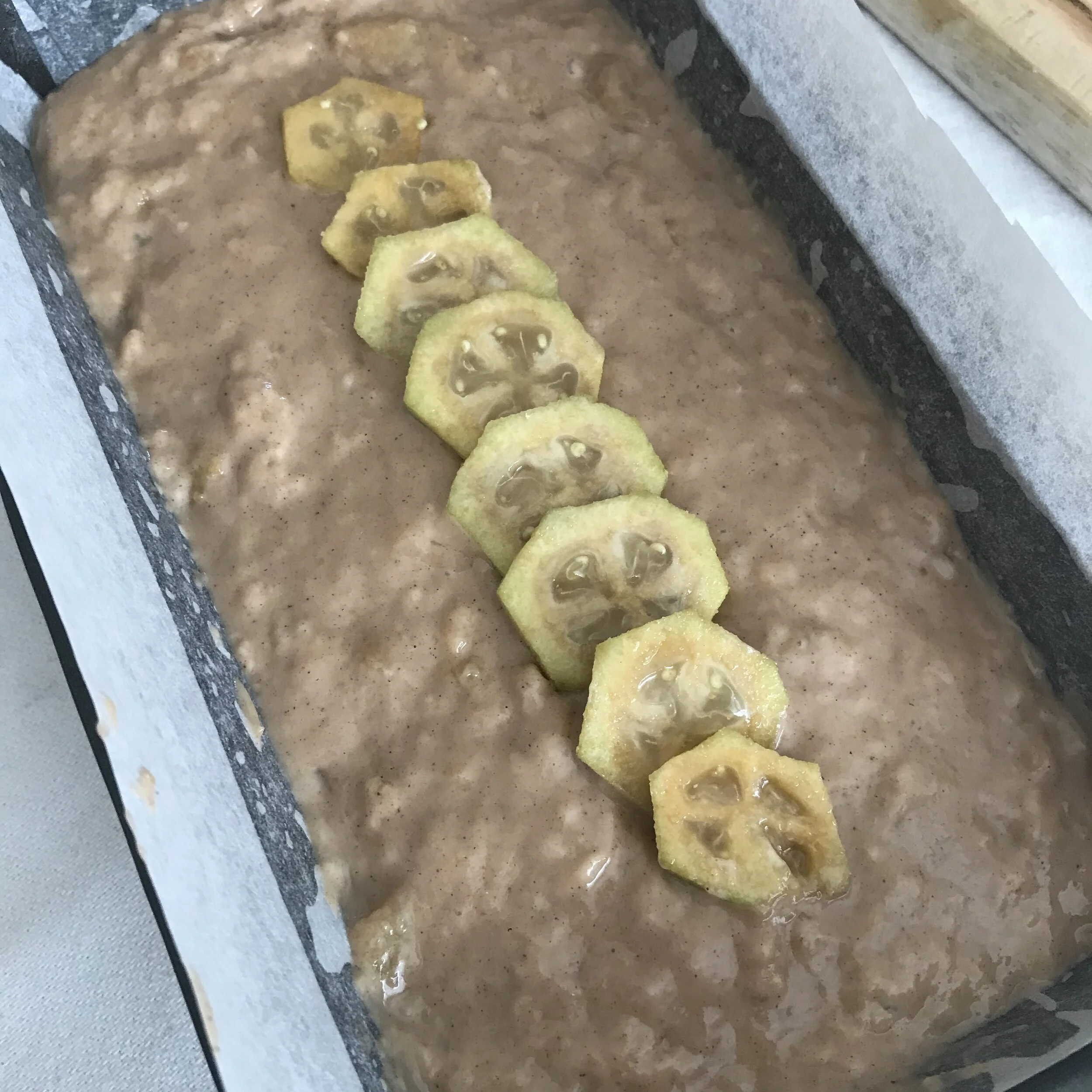 7. Arrange the feijoa slices on top (if using). Bake loaf for about 45 minutes, or until a skewer inserted in the middle comes out clean.