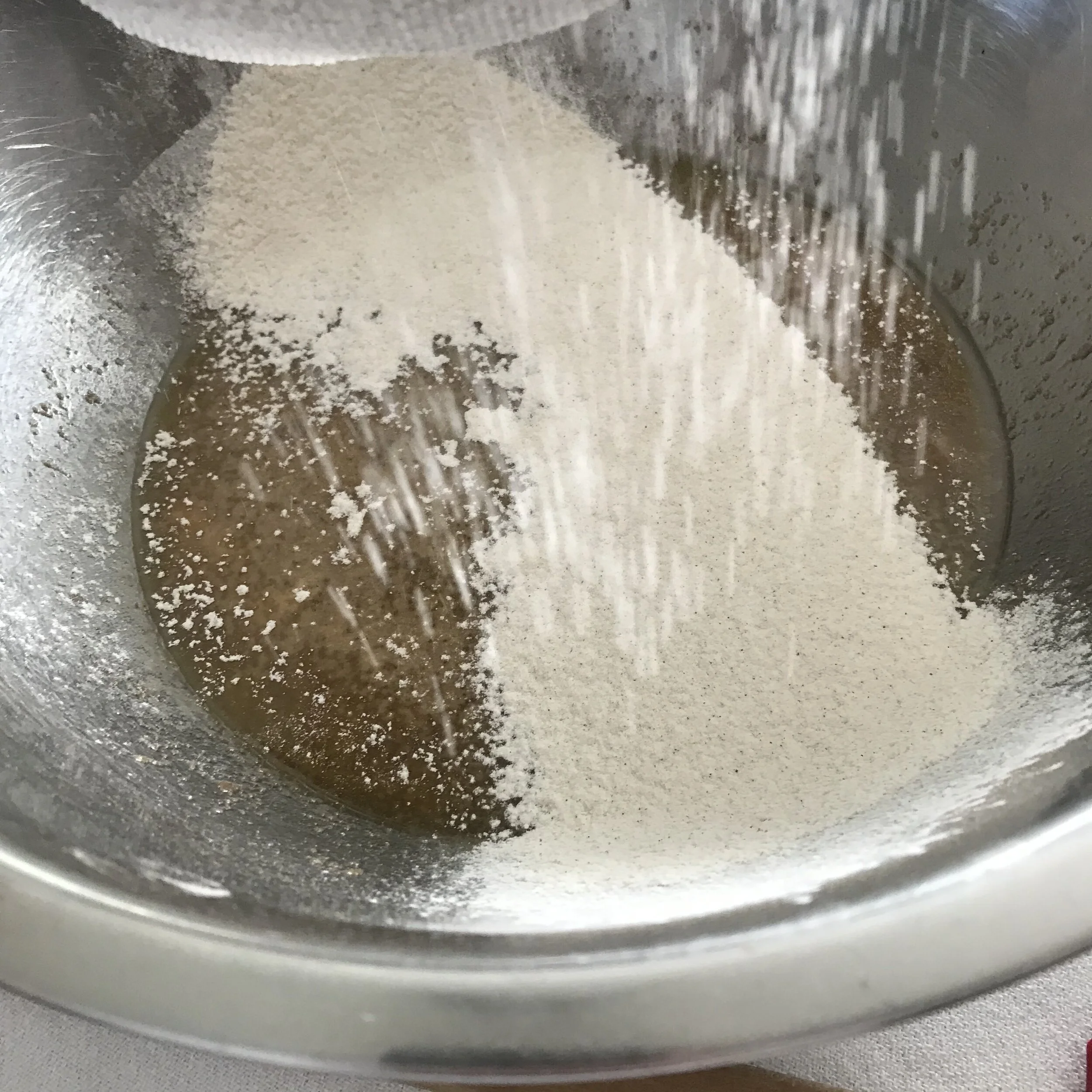 5. Once feijoa mix has cooled down to tepid, sieve in the flour mix and gently fold with a spatula until well incorporated.