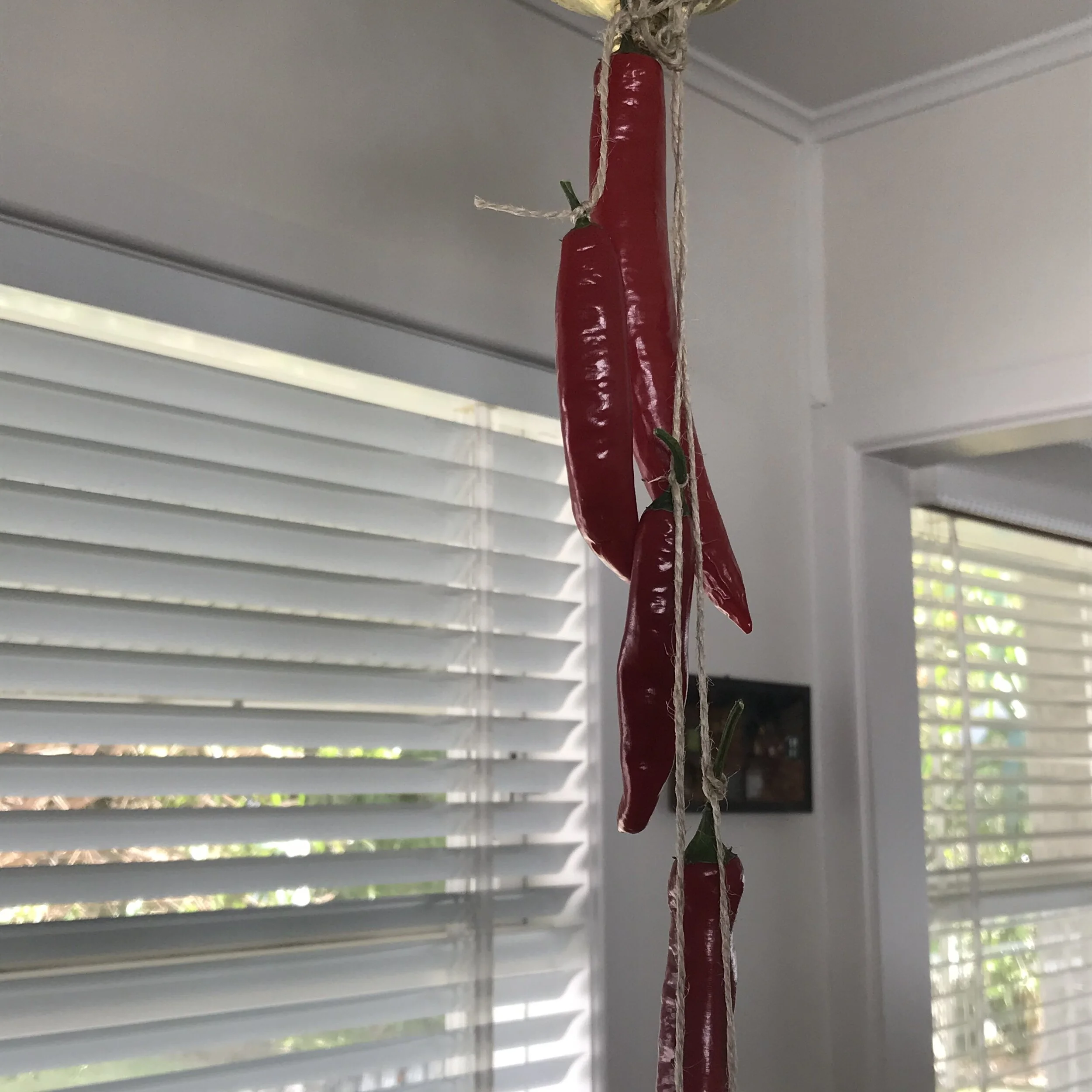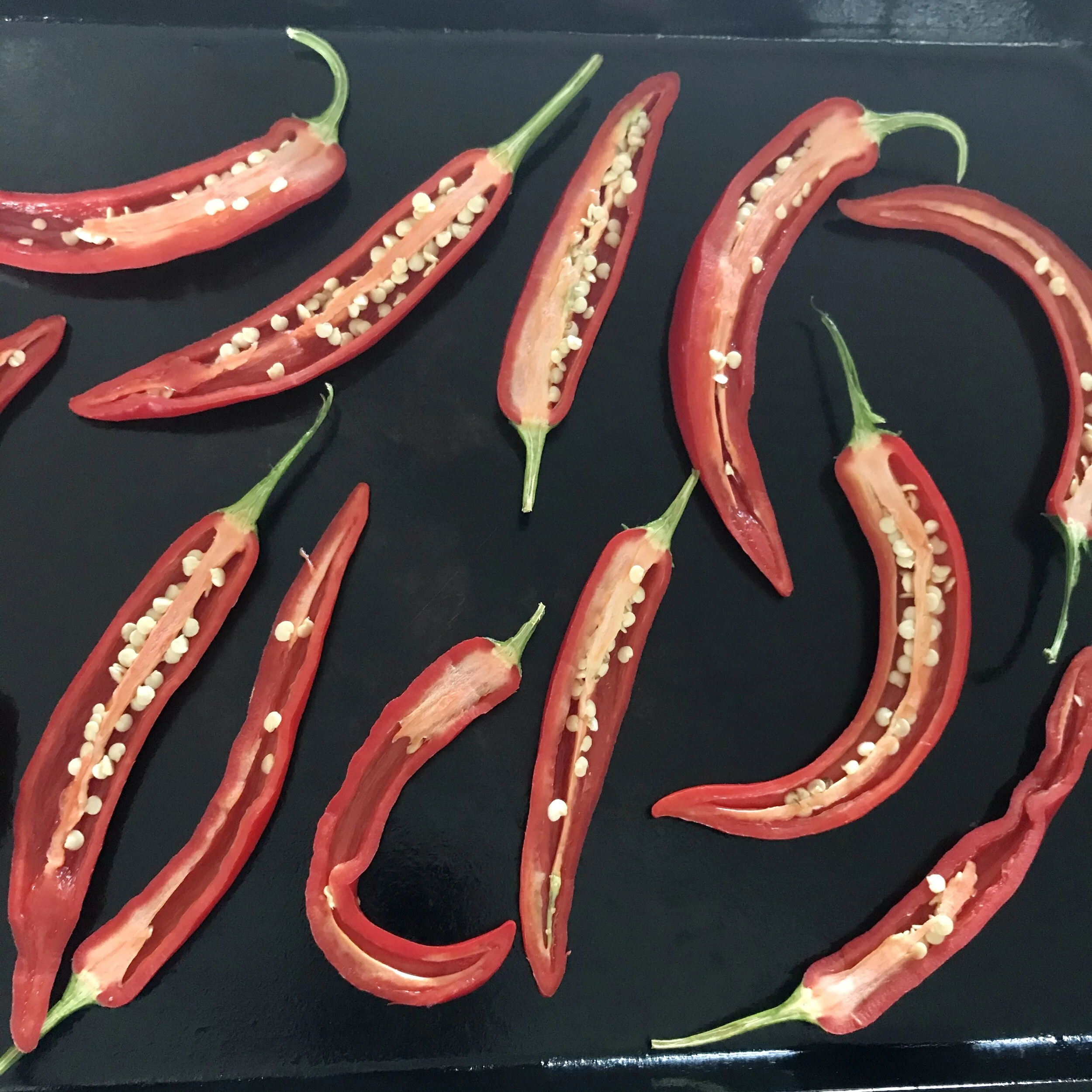 3. PREPARE: Cut each chilli in half lengthwise, and place cut side up on a tray. Place tray in a dry and dark room, or by the hot water cupboard. Alternatively, tie each chilli to a long piece of string and hang in a dry place.