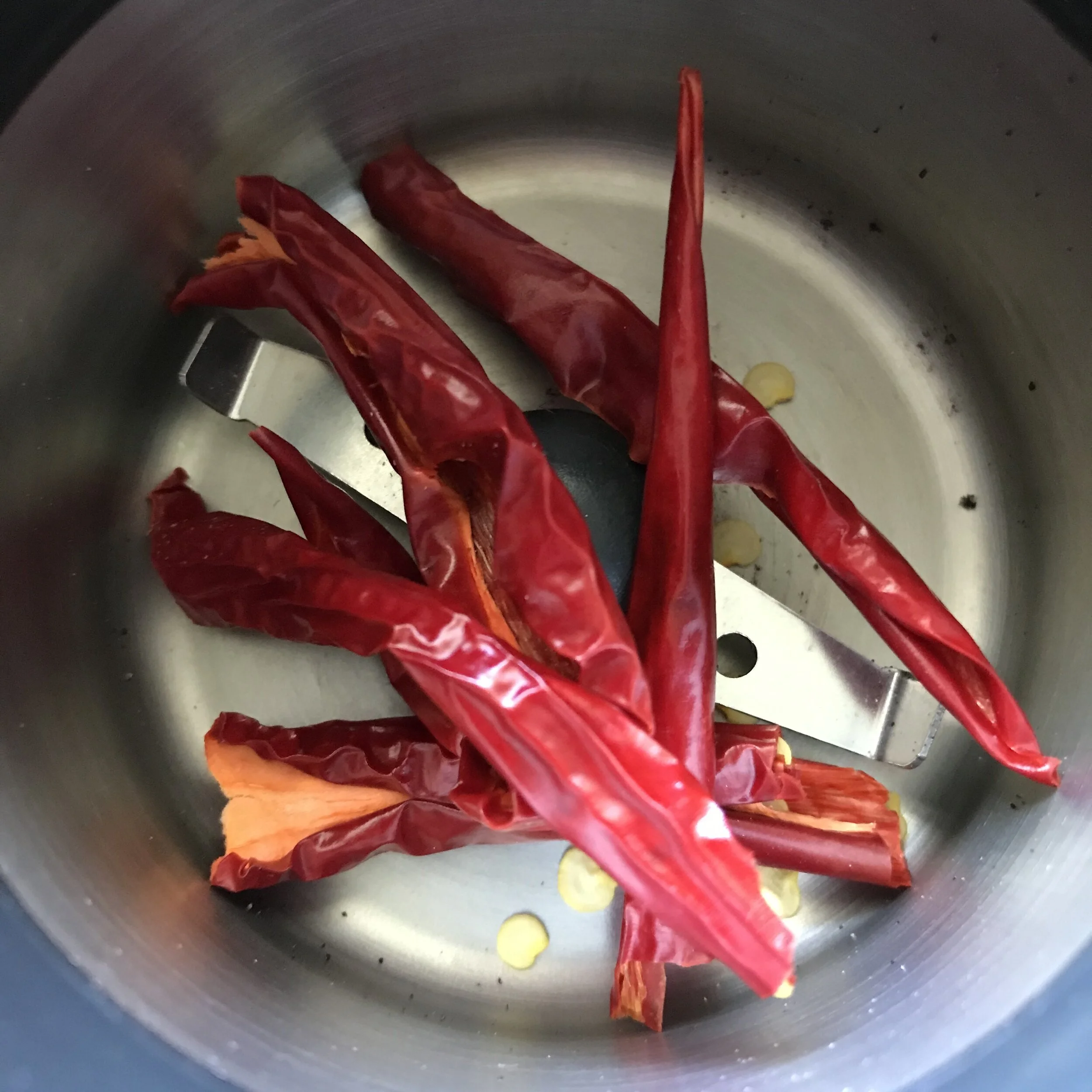 3. Brake dried chillies into 2 or 3 smaller pieces and using a pestle and mortar or spice grinder, grind until flaked (you could also use a sharp knife).