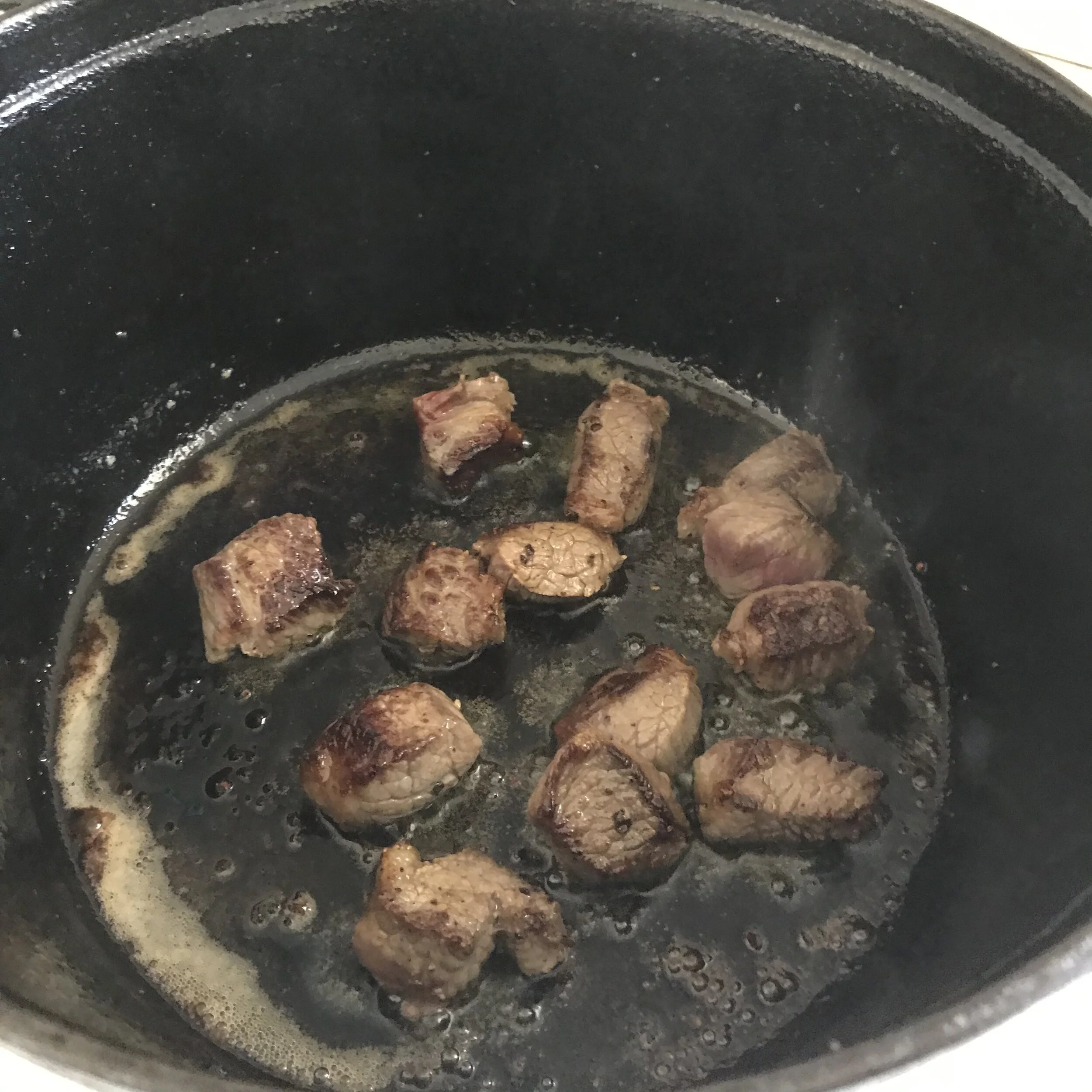 2. Heat the olive oil (or alternative) in a thick-bottomed pot and brown the meat in two or three batches. Remove browned meat to a side plate or bowl and reserve.