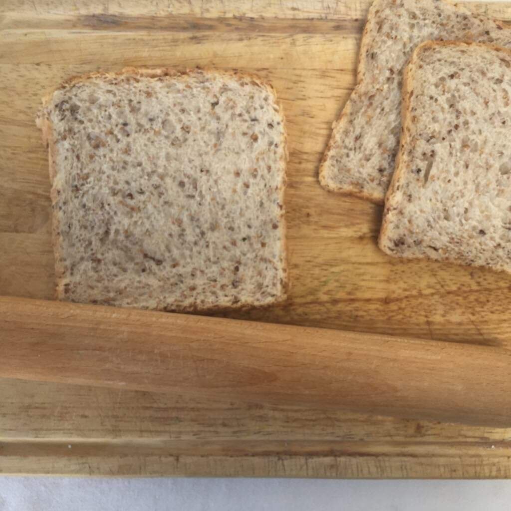 1. Place a slice of bread on the board and flatten well with a rolling pin. Repeat with other slices.