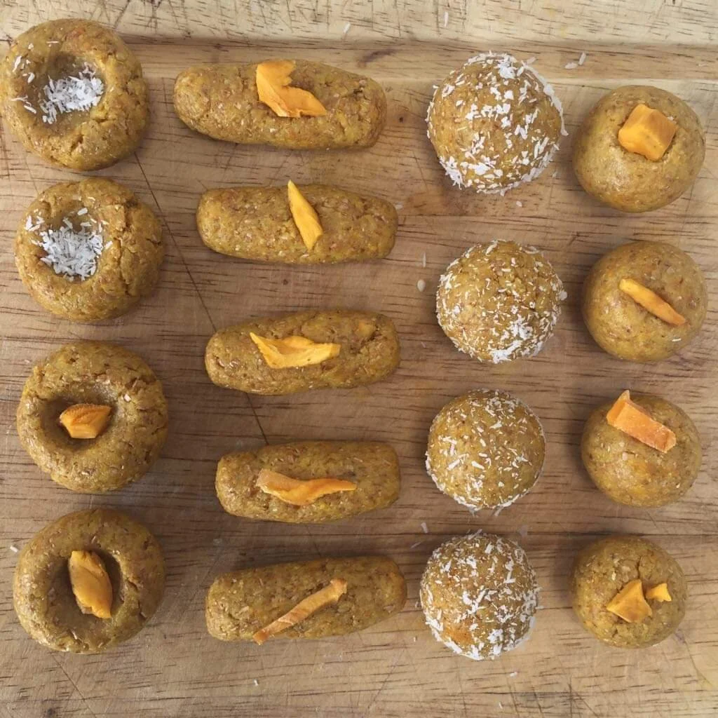 Mango & Coconut “Lassi” Bliss Balls and Curried Potato Roll-Ups