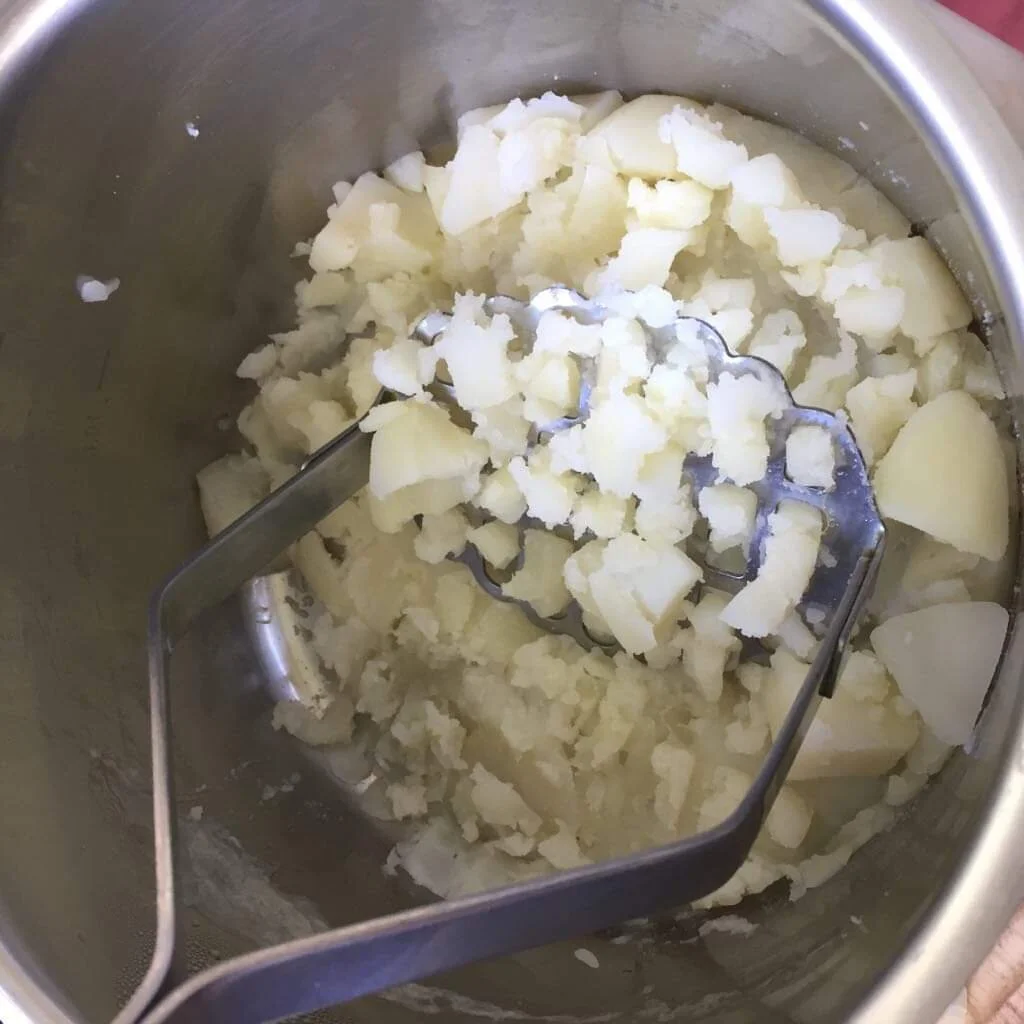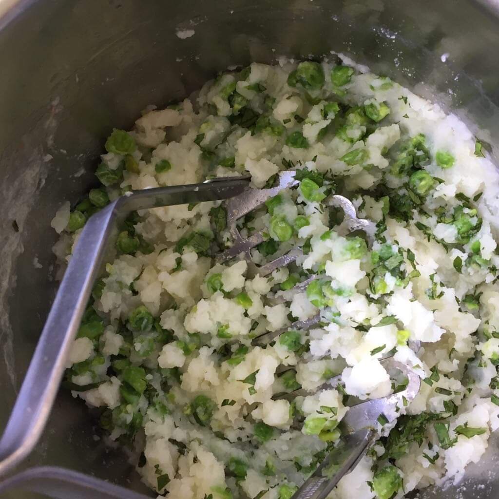 1. Place potatoes in a pot, cover with water and simmer until soft. Add the peas to the pot and cook for a couple more minutes. Drain well and set aside.