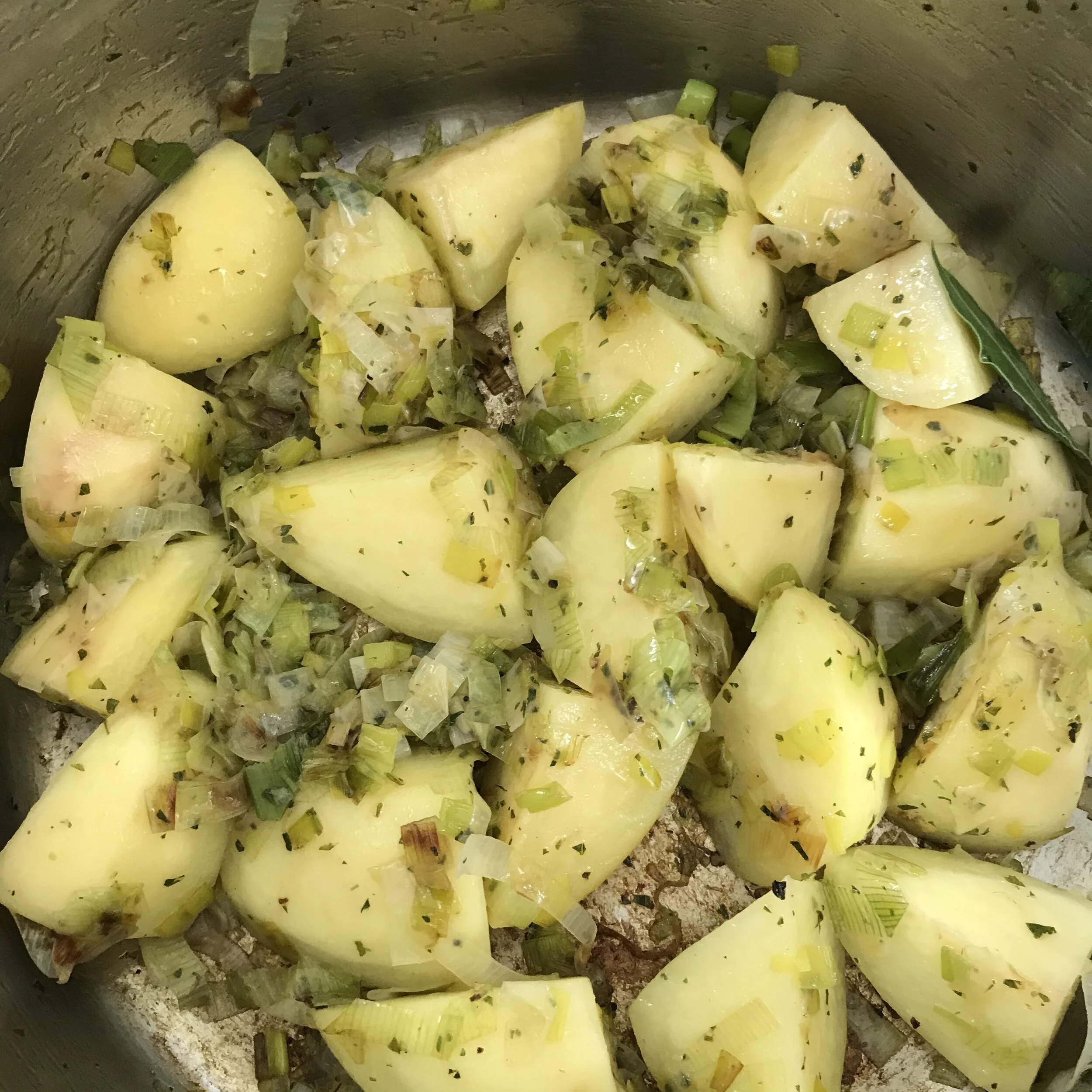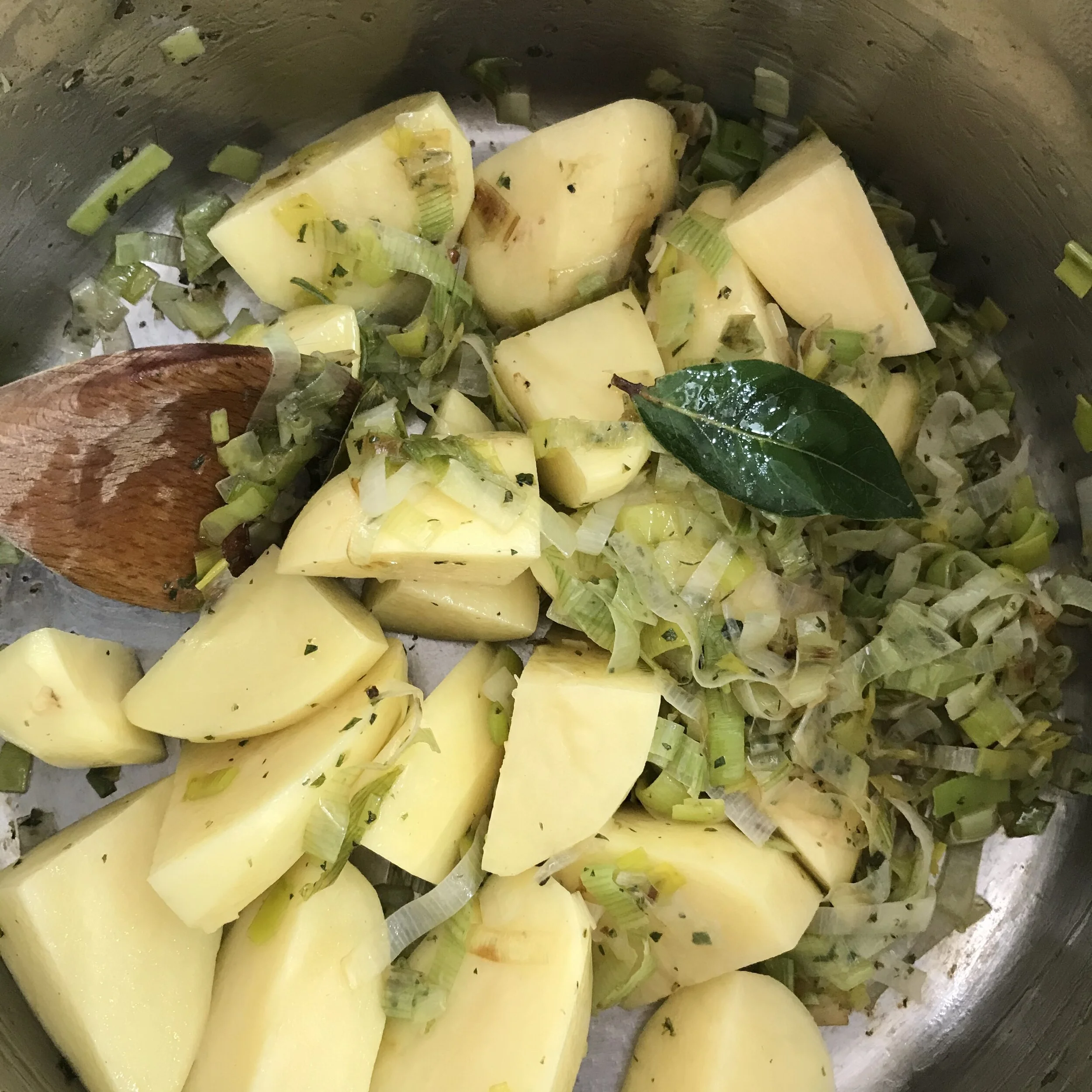 3. Once leeks are soft, add the potatoes and the bay leaf. Cook for an extra 5 minutes, stirring again to prevent sticking to the bottom.