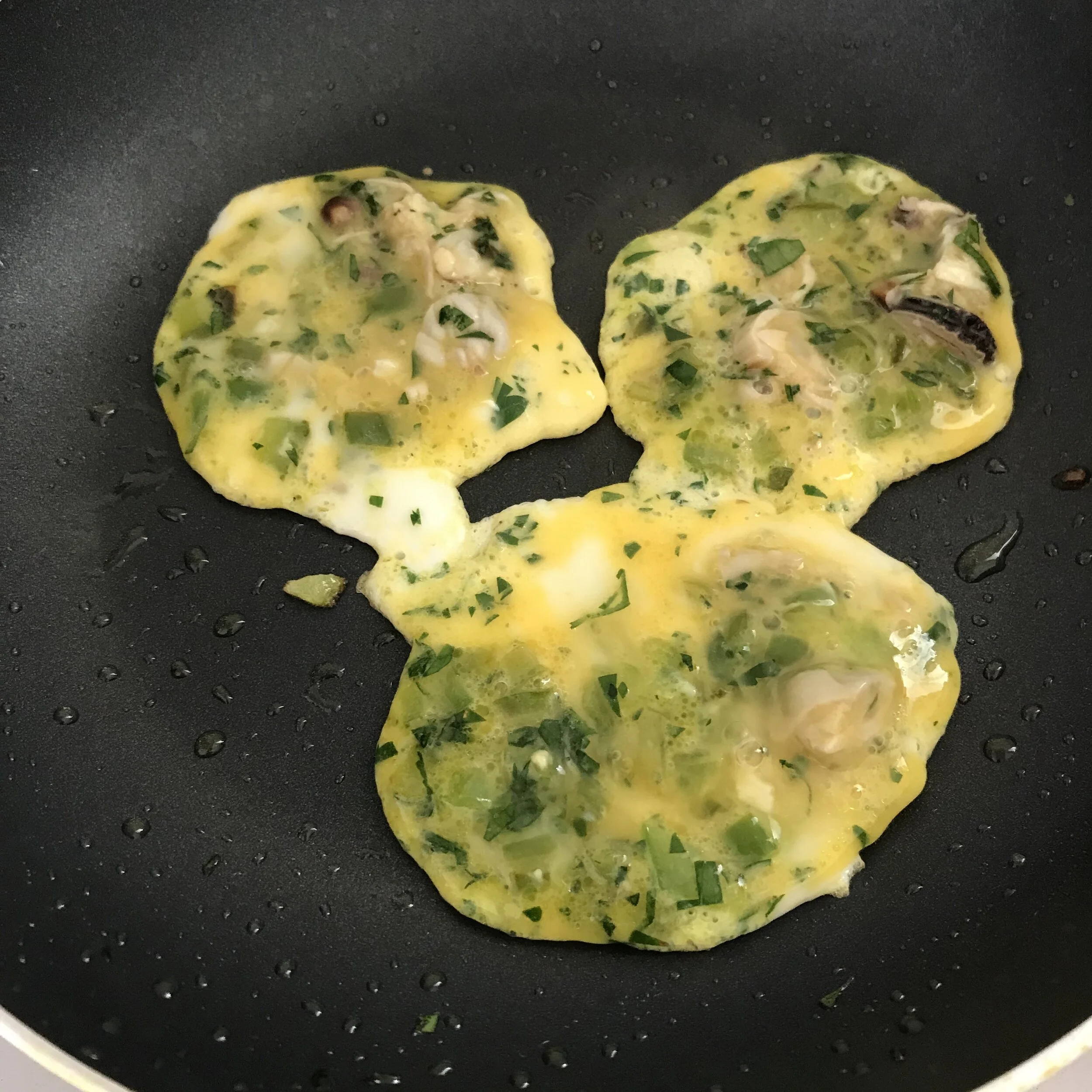2. Spray (or coat) a non-stick frying pan with olive oil (or alternative), and add spoonfuls of egg mix, making sure there are a few mussel pieces in each.