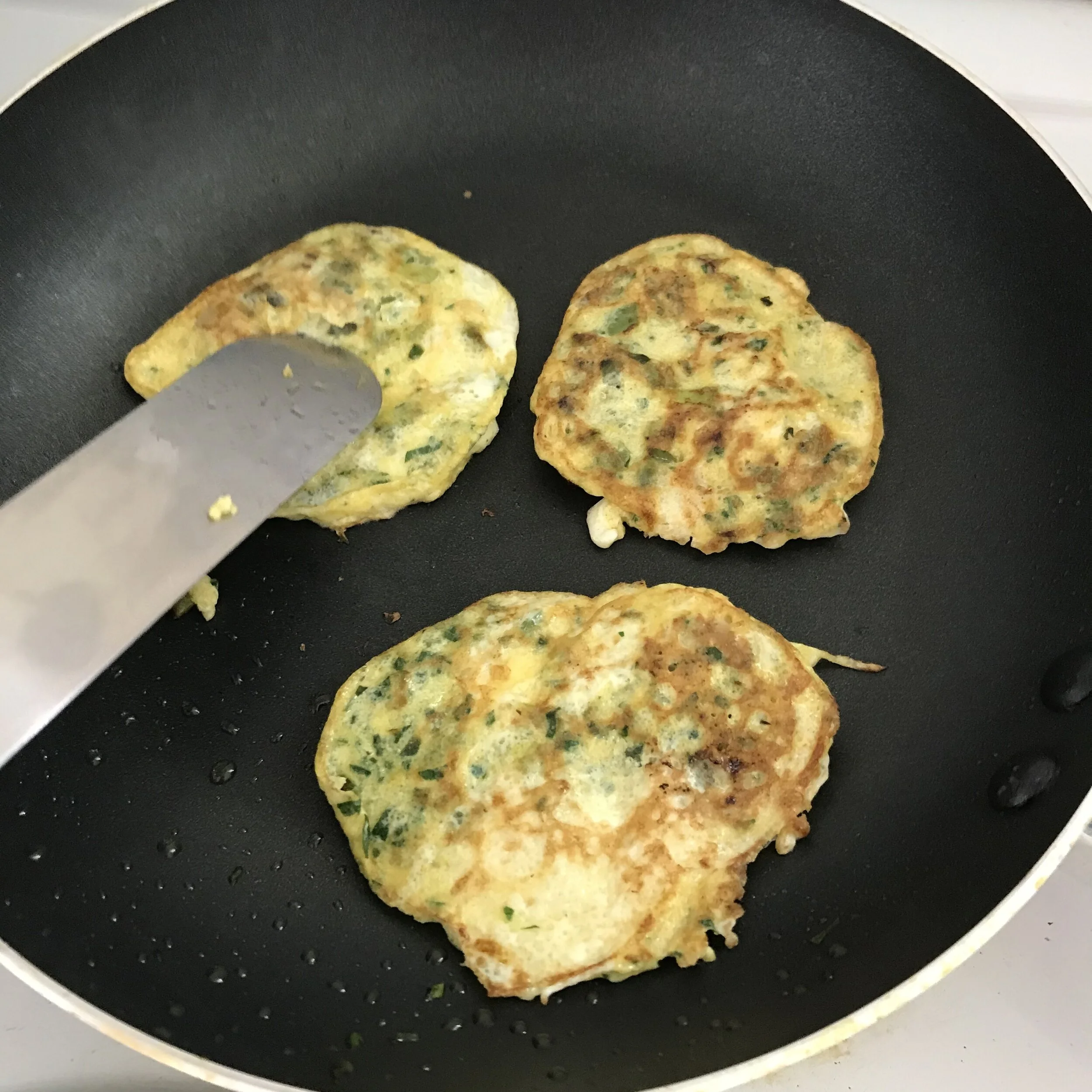 3. Fry for 2 -3 minutes and, using a spatula, carefully flip the egg pancakes to cook the other side. Once cooked, lift egg foo yung and place on a plate. Repeat with remaining egg mix.