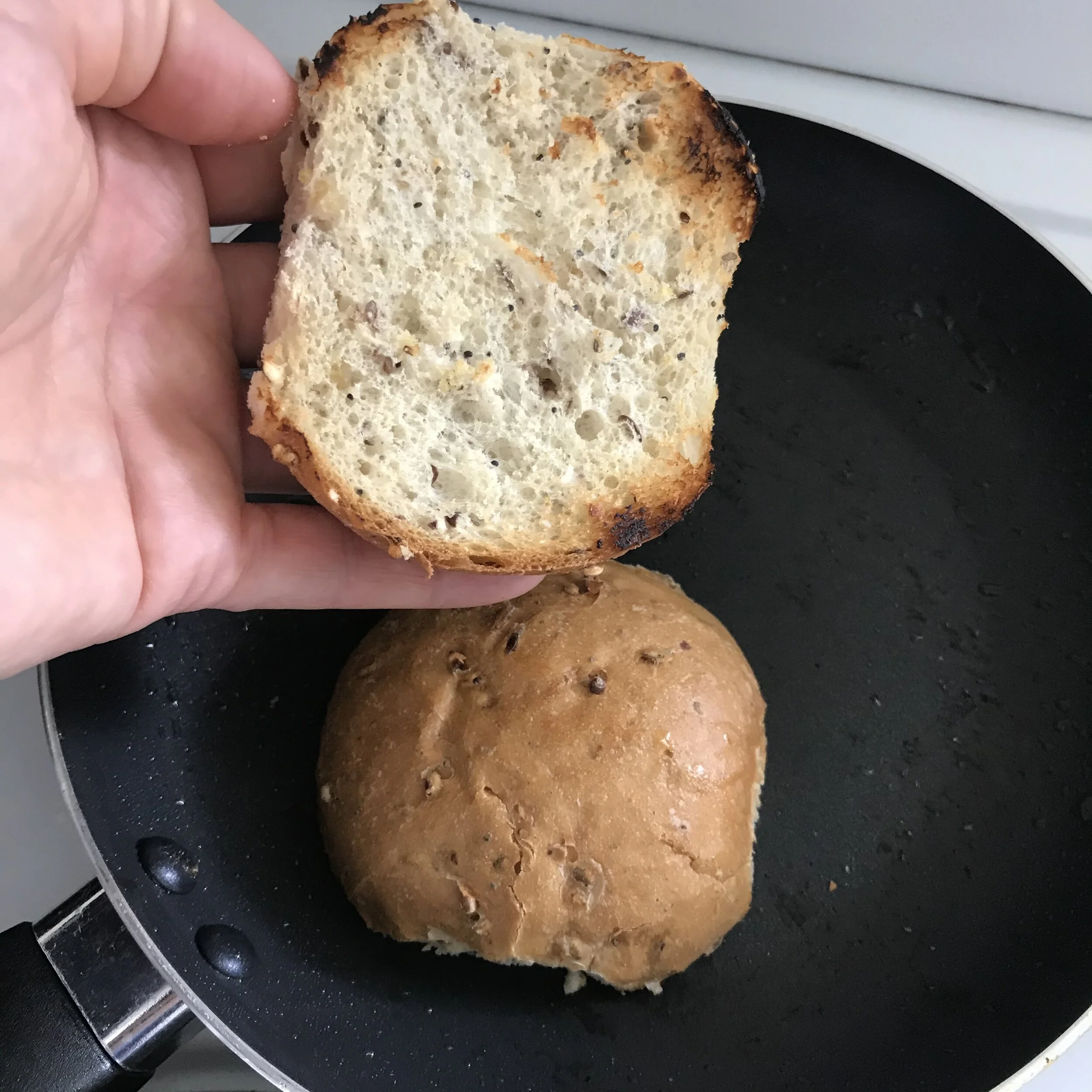5. In the same frying pan, or under a hot grill, lightly toast the seeded rolls’ halves. Spread each toasted roll half with a little Japanese mayo (or butter).