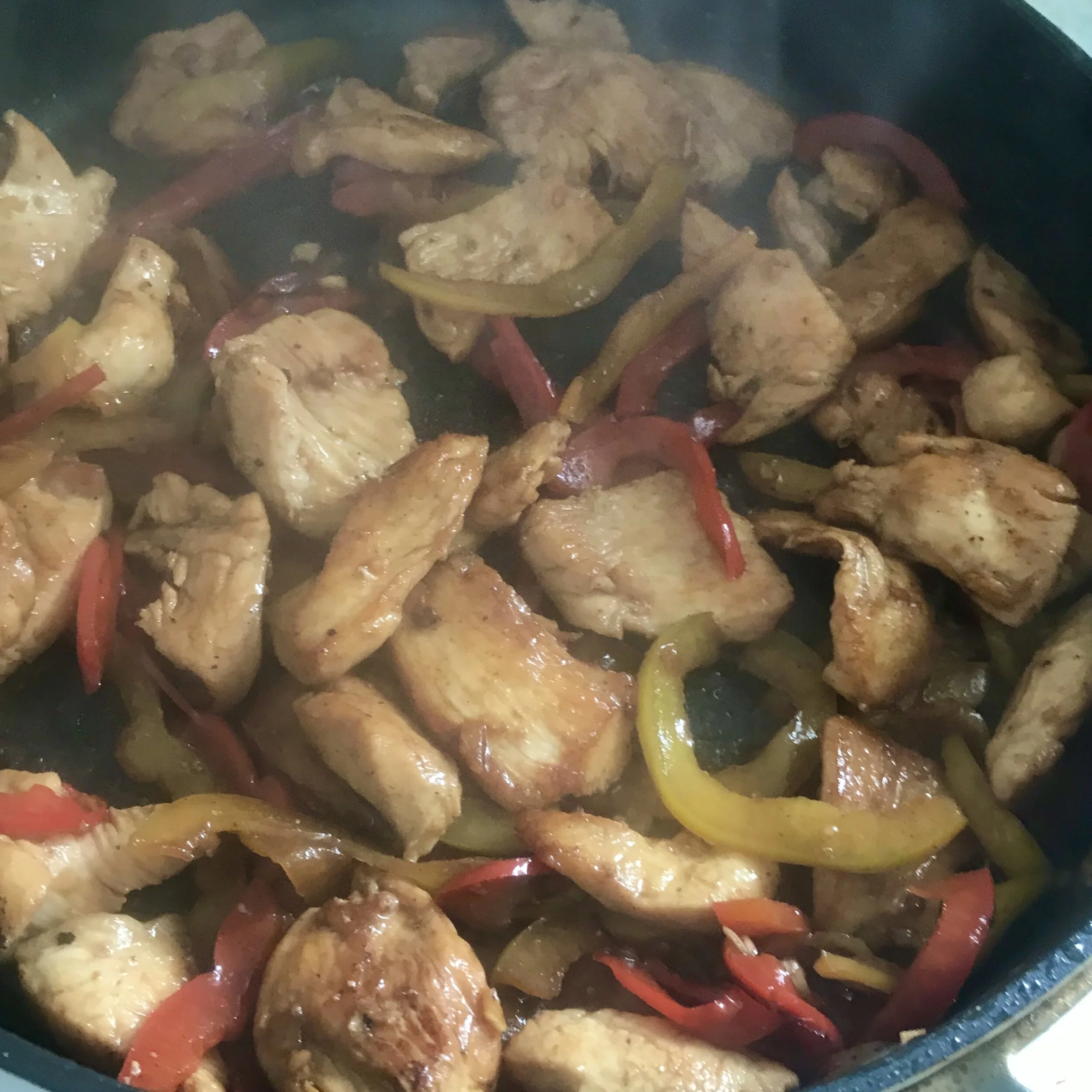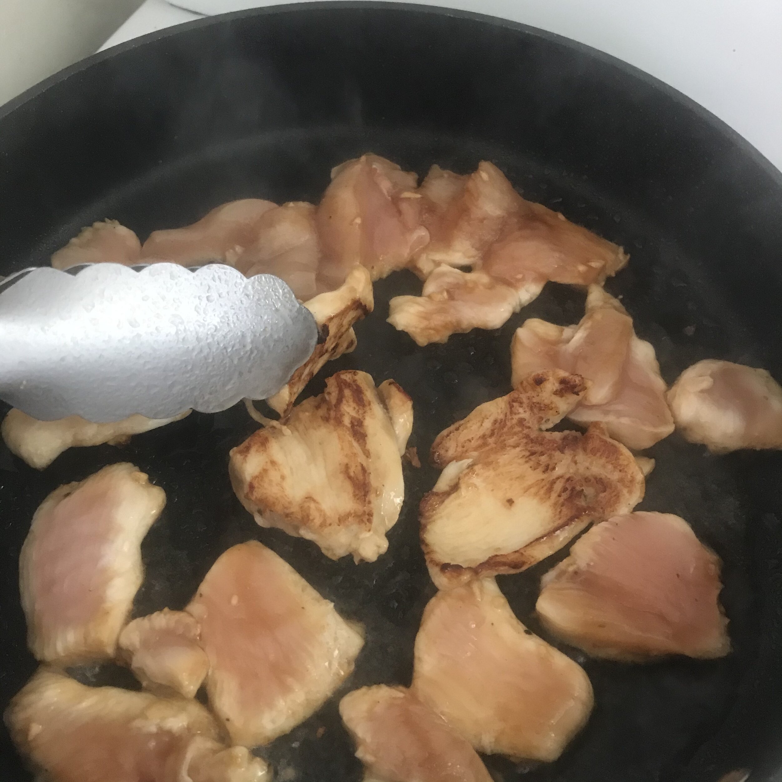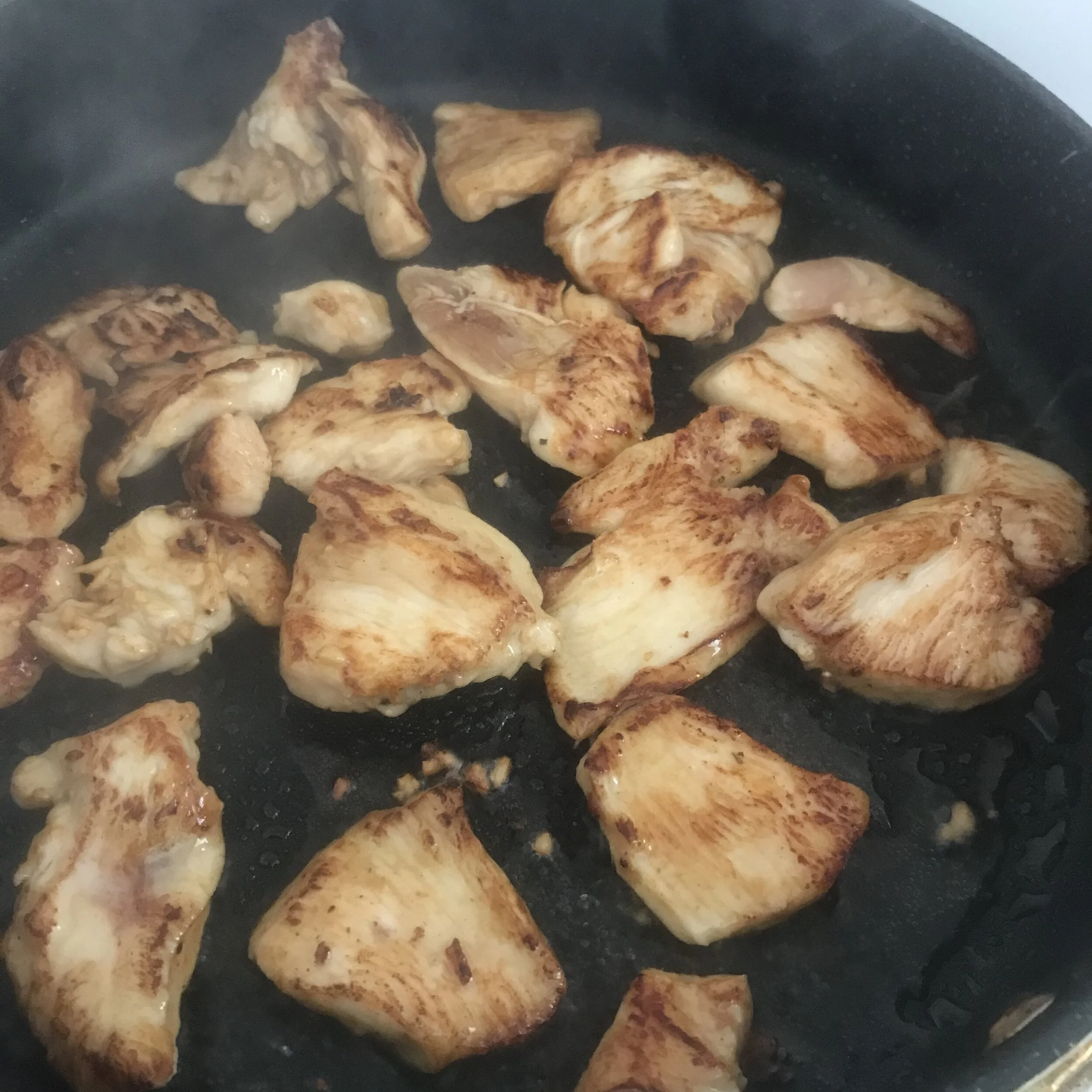 1. In a frying pan or wok, heat 1 Tbsp of oil and fry the marinating chicken pieces in batches, until nicely browned on both sides. (The easiest way to achieve this is to lay a few chicken pieces in the pan and let them sear, without touching or moving them, as this causes the meat to release juices, and prevents meat browning. Turn chicken pieces over and repeat.)
