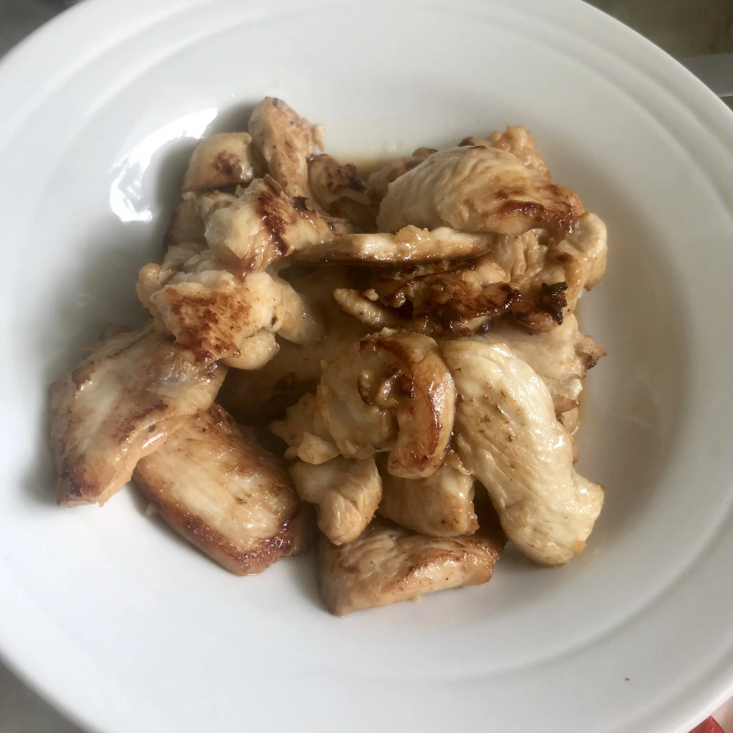 2. Transfer cooked chicken pieces to a plate until all chicken is done.