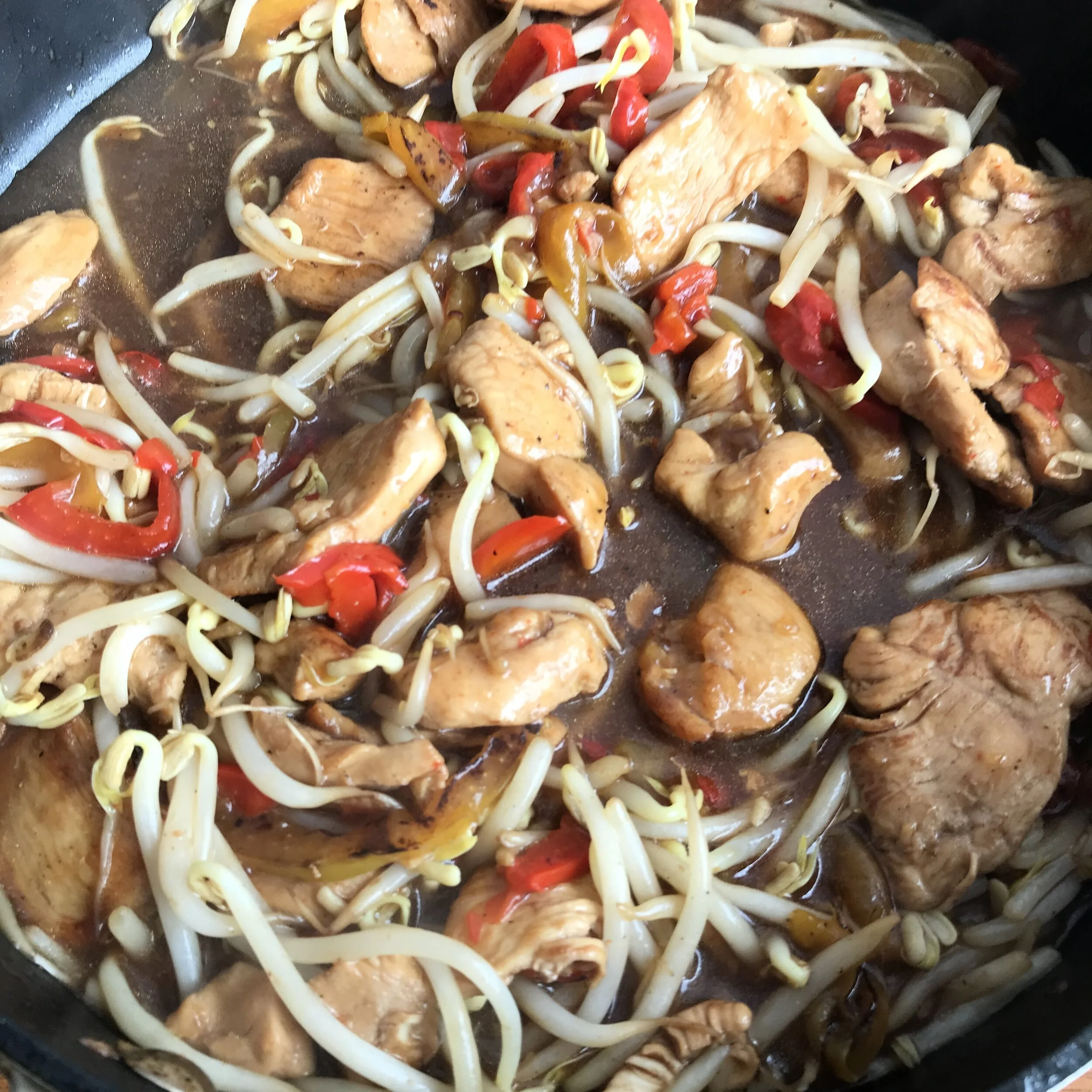 6. Add bean sprouts and stir. They should only take a minute or so to wilt. Check seasoning, adding a little more soy sauce, salt or pepper, if needed.