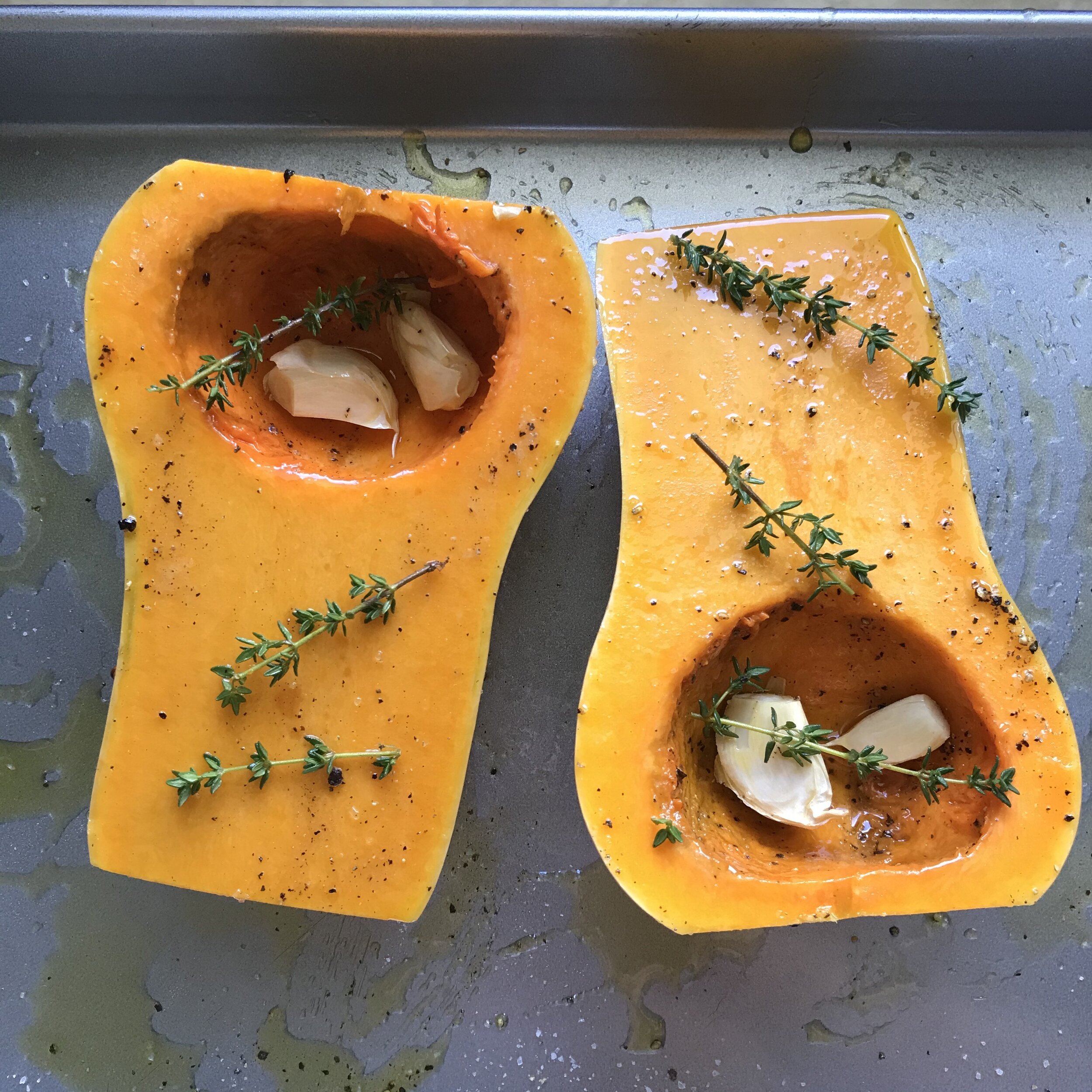 2. Lightly oil a roasting tray big enough to accommodate the butternut halves. Season squash with salt and pepper and rub some olive oil all over. Now pop 2 garlic cloves inside each cavity and scatter the thyme sprigs over the top – rubbing some olive oil on them too.