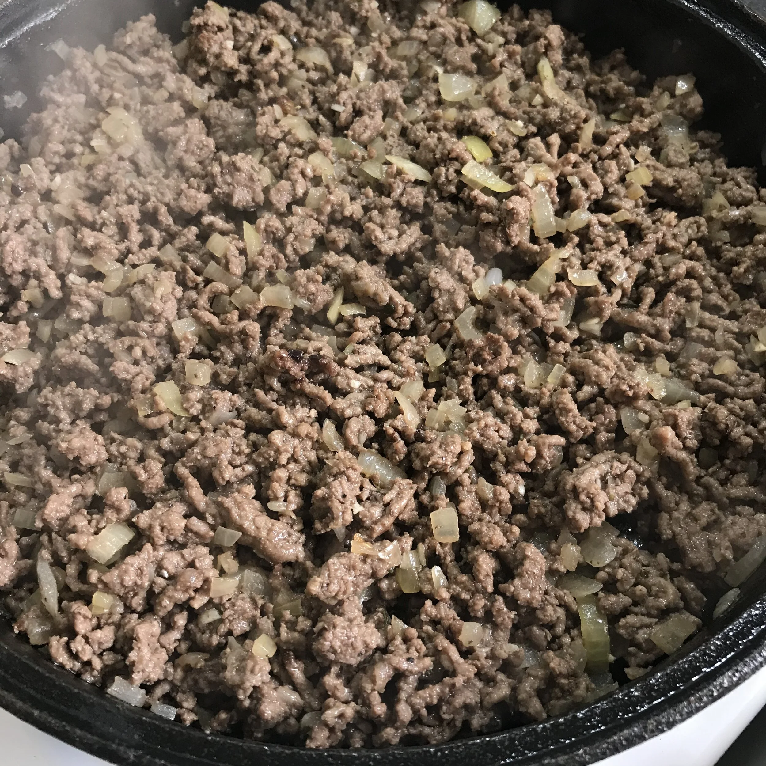5. Turn up the heat and add the mince, breaking it in small pieces until all large lumps are gone. This will take a few minutes. Now add the Worcestershire sauce and continue frying the mince on high heat, until you start getting some brown bits – this will add a lot of flavour to the final dish and the best way to achieve this is to leave the mince for a few minutes without stirring.