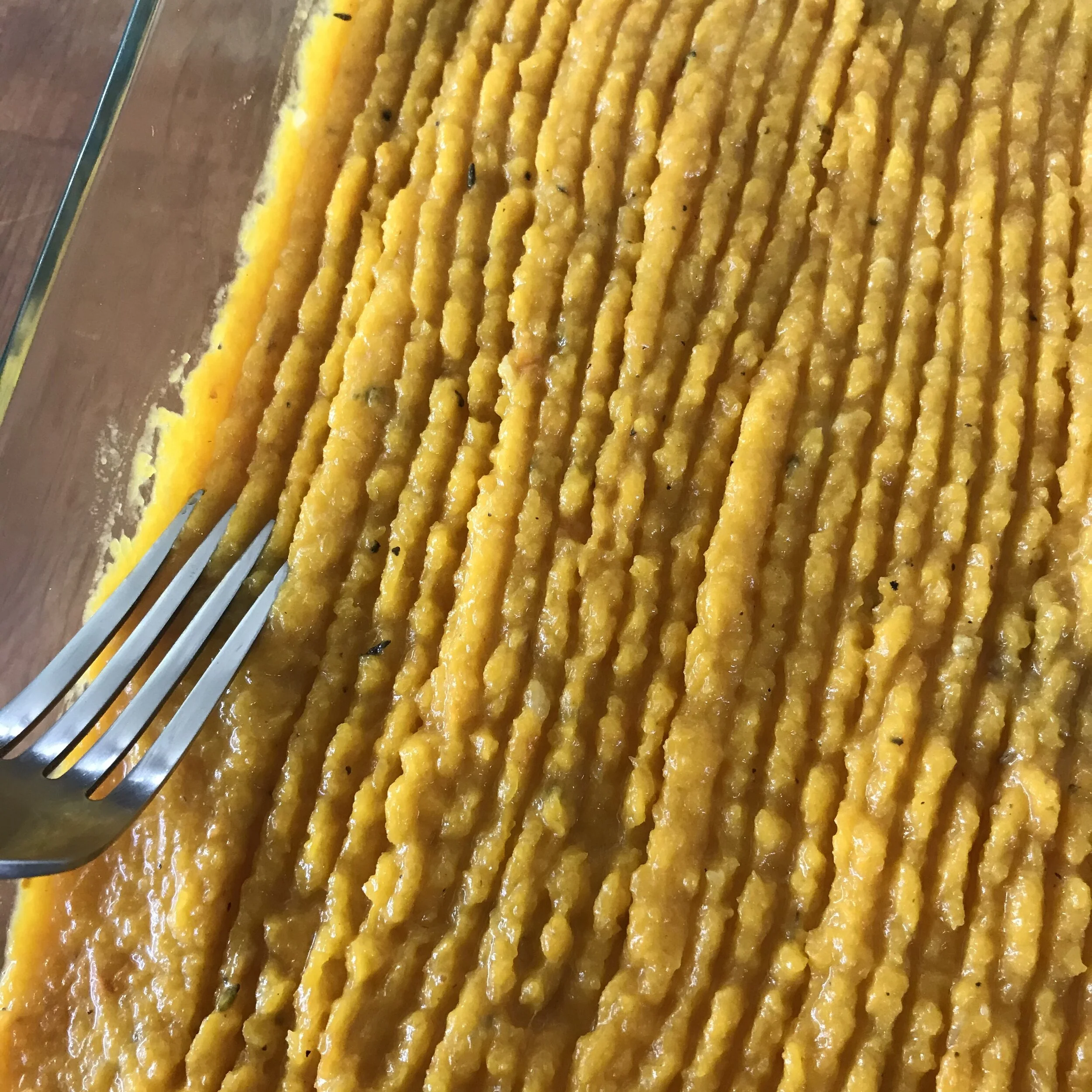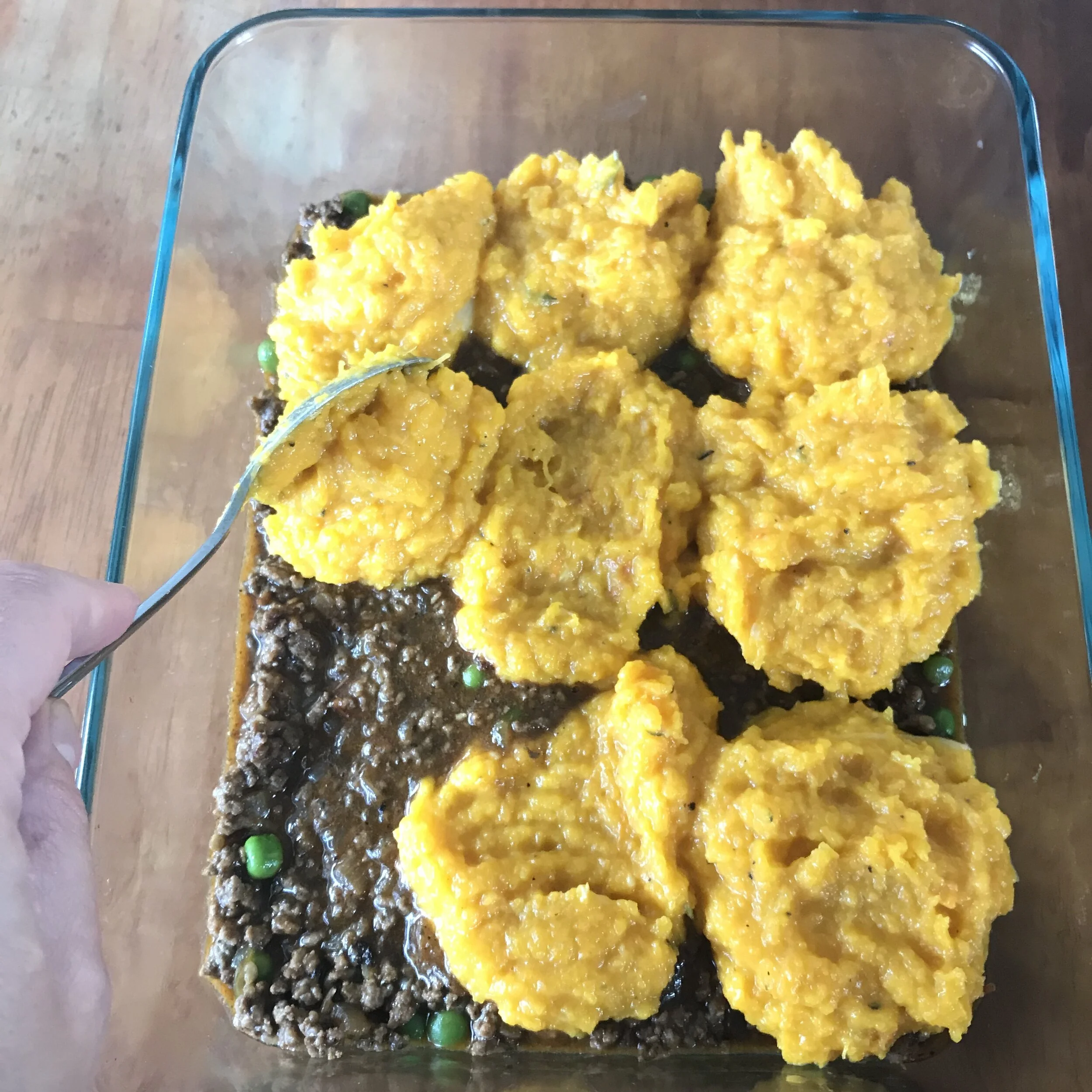 9. To assemble Cottage Pie, cover savoury mince with spoonfuls of the butternut mash, then smooth it out to cover the whole surface of the mince. If you wish to decorate the top of the pie, gently run a fork from one end of the dish to the other (see picture).