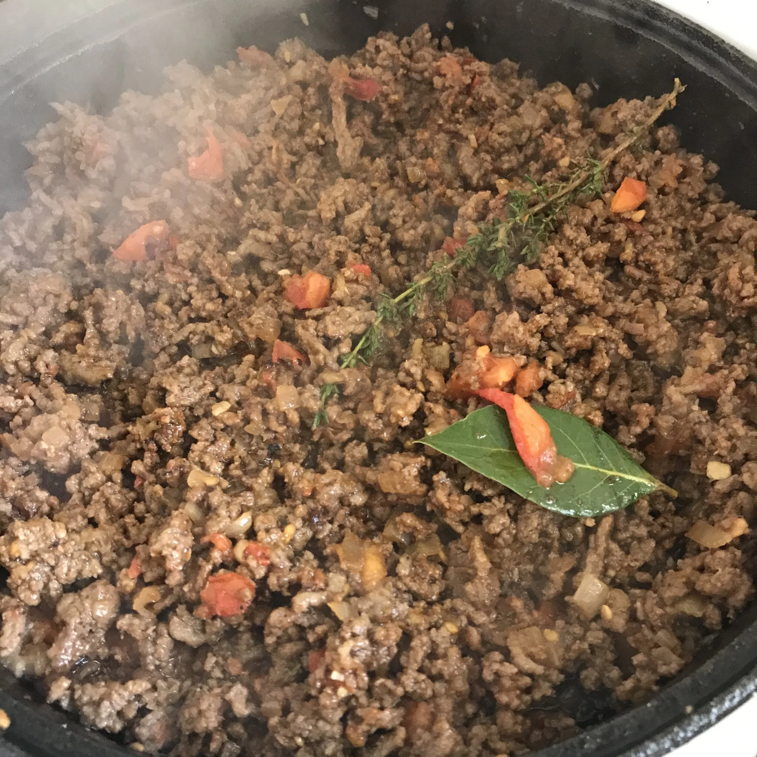 4. To make the Savoury Mince: In a saucepan over medium heat, add a generous drizzle of olive oil and add the onion, cooking for a few minutes until it starts to soften. Add garlic and chopped thyme and cook for an extra 2 -3 minutes. Season with a little salt and pepper.