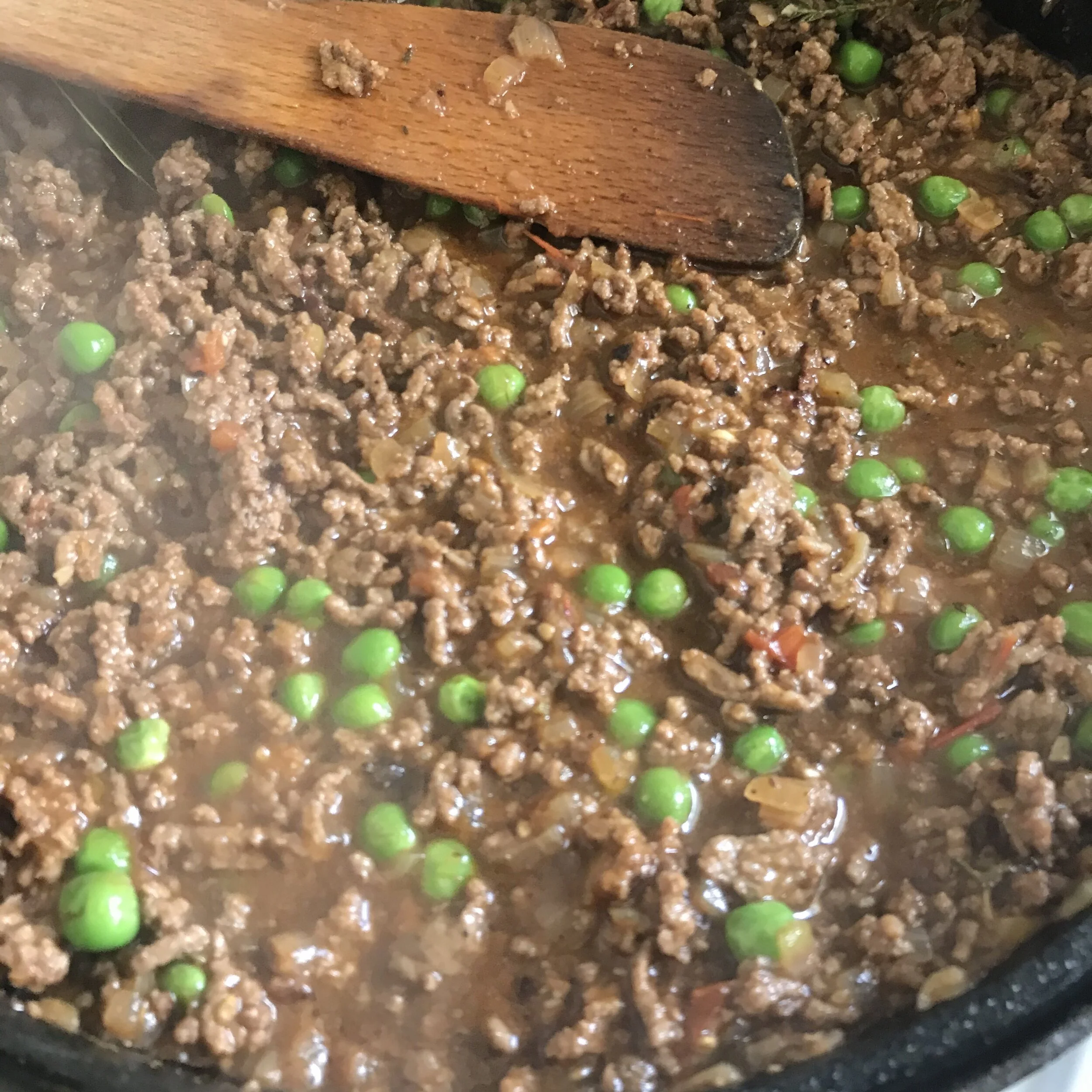 6. Add the tomato paste, chopped tomatoes, bay leaf and extra sprig of thyme (if using). Stir and cook for a few more minutes until tomatoes have broken down. Add the stock or water, bring to the boil, then turn down the heat and let it cook for about 5 minutes. Add the peas and cook for an extra 3 minutes.