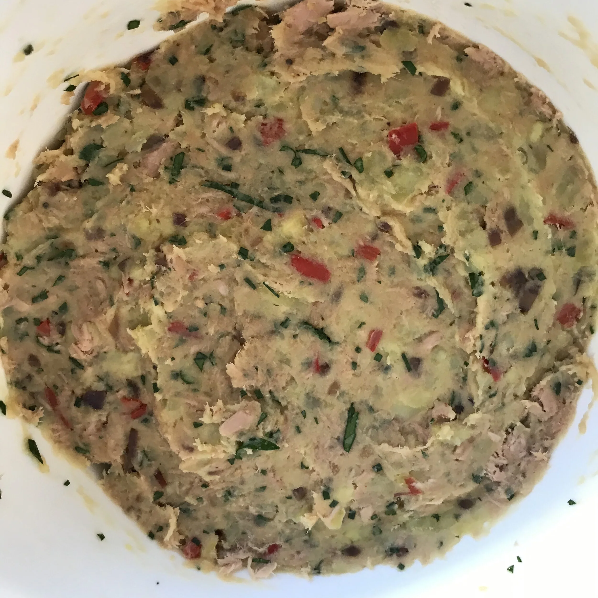 4. Add the onion and tuna mix and lightly beaten egg to the mashed kumara. Mix until well incorporated. Check seasoning.